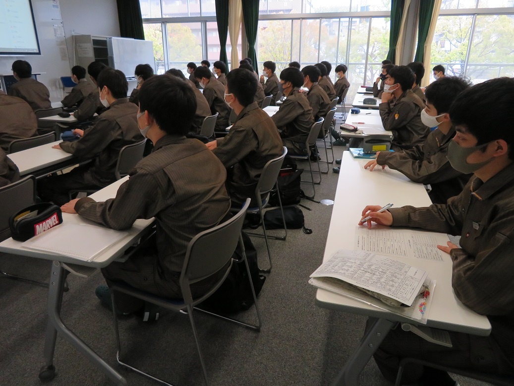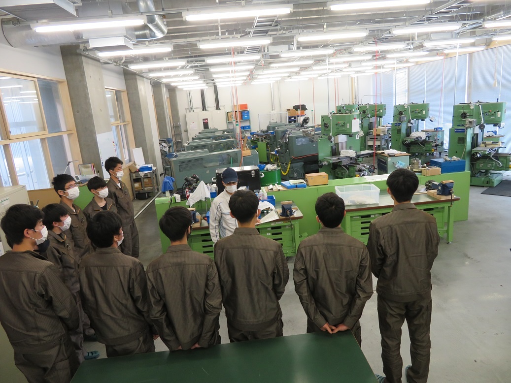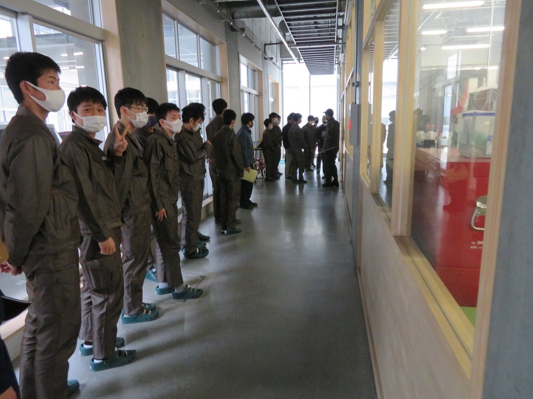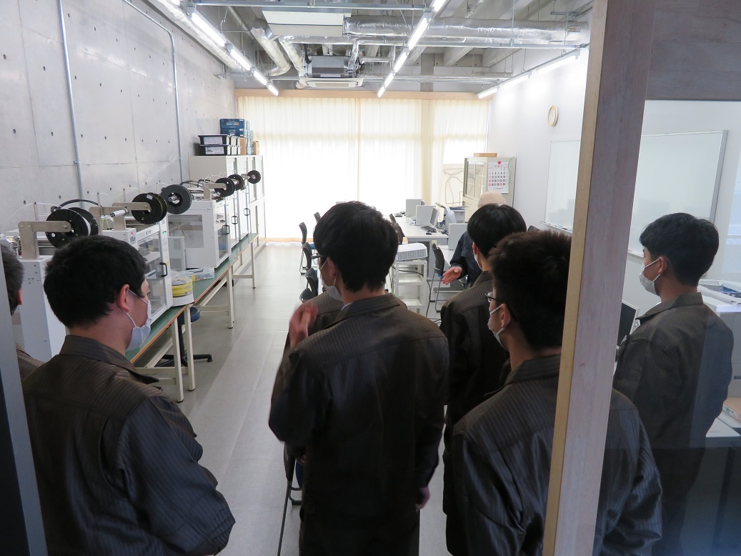 テーマ決め希望調査・安全講話・実習室紹介 実習室紹介ではコース毎に分かれ、専攻科の充実した施設・設備を見て回りました。1年生の総合実習は明日の午後から始まります。