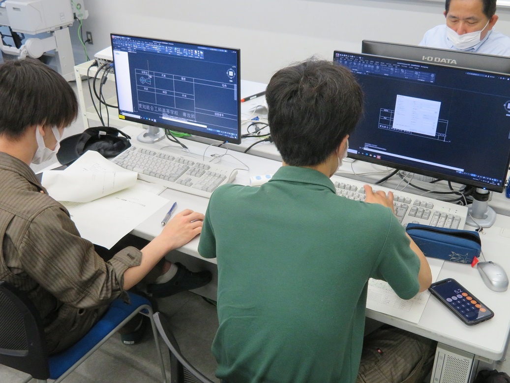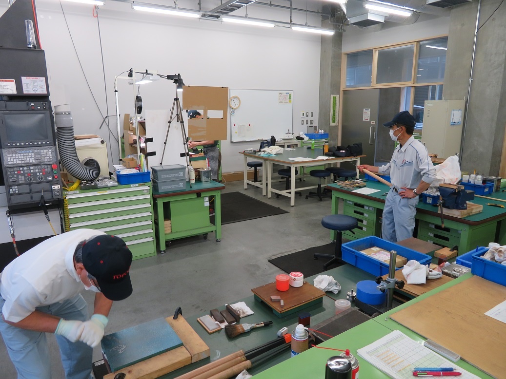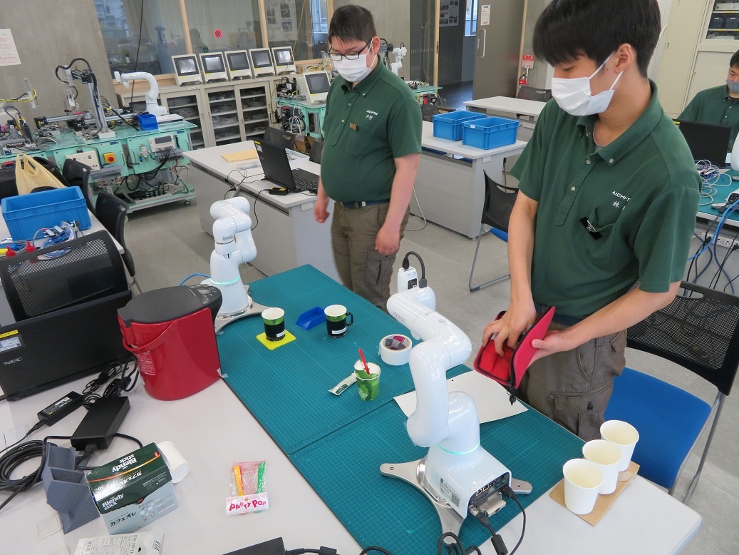 各テーマに取り組みました。デンソー先端ロボット制御技術の研究と実践では、COBOTTAを使ったアイスコーヒー作りとドミノに取り組んでいます。 また技能五輪(機械組立)を目指し日々練習に取り組んでいる生徒がいますが、そこで使う道具のきさげ作業を担当教員2人がかりで行っていました。専攻科にはやる気さえあれば取り組むことができる環境があります。おおいに活用して欲しいです。