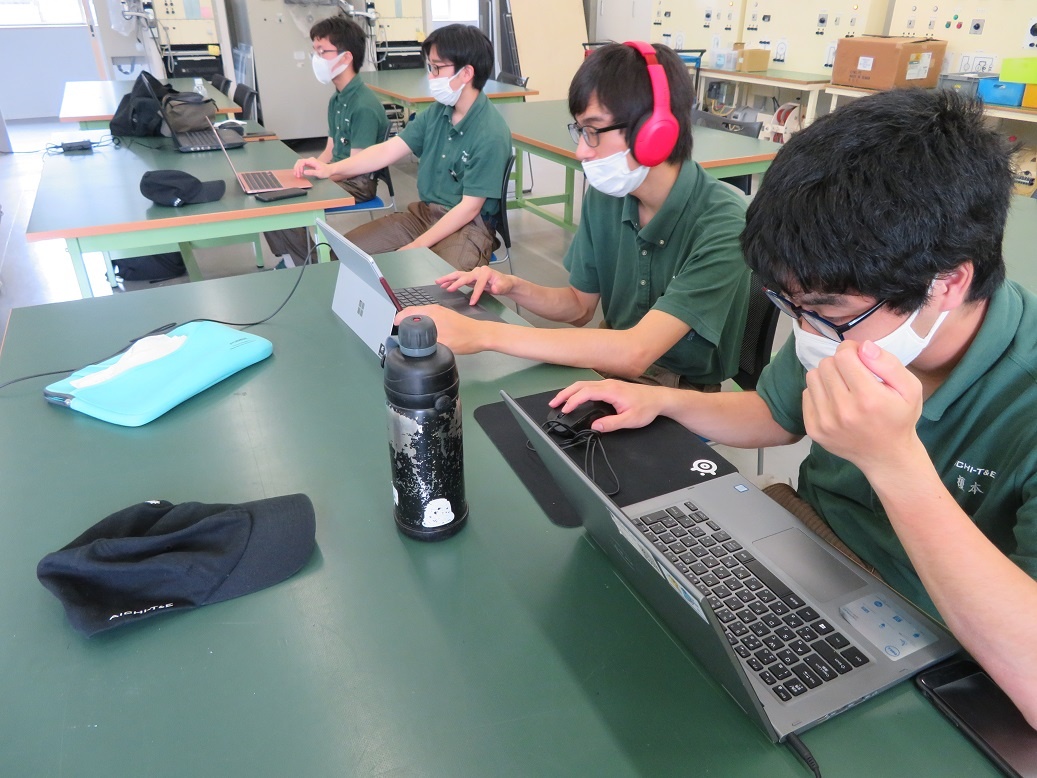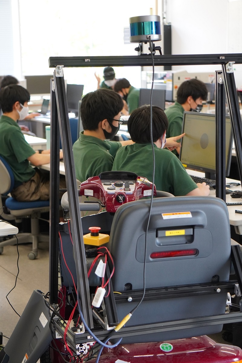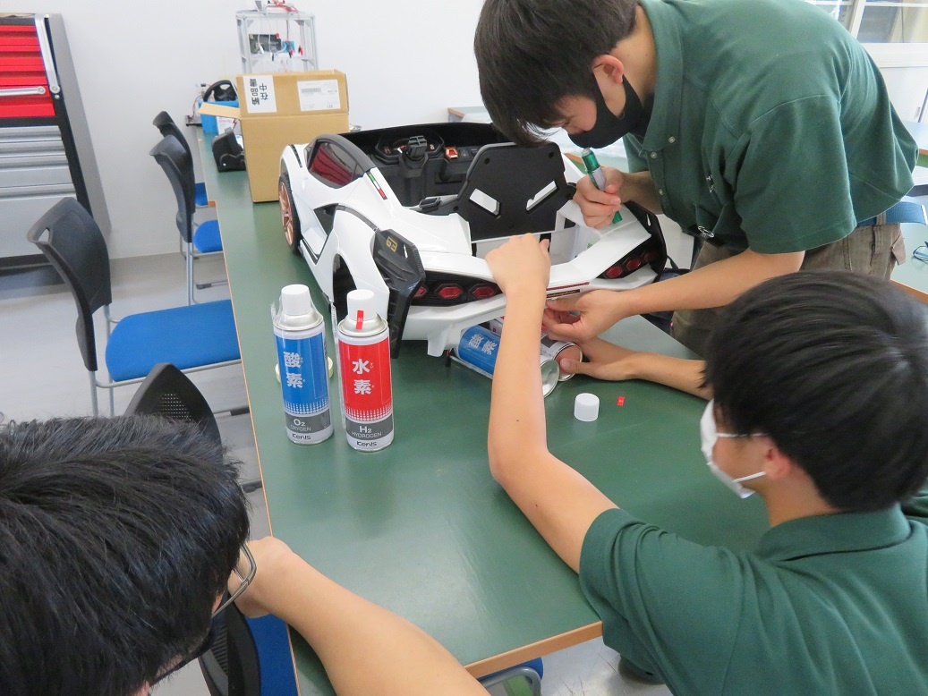 今週も各テーマにそれぞれ取り組みました。 「Li電池、FCエネルギーを活用した新モビリティの研究と実践」では、車体に水素と酸素のボンベを取り付ける作業を行いました。取り付けるためのケースは部品のデータ作成から、加工(レーザー加工機)まで生徒で行いました。また水素と酸素から電気と水ができるため、できた水はボディに穴を開け、加湿機能として利用できる工夫もしました。