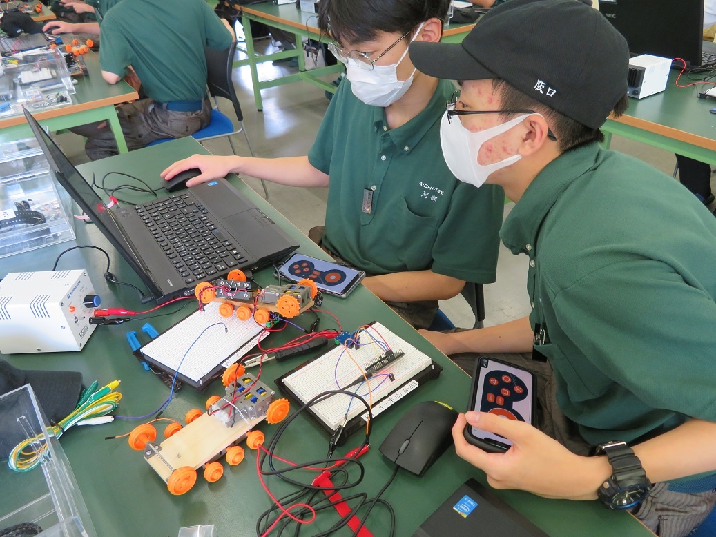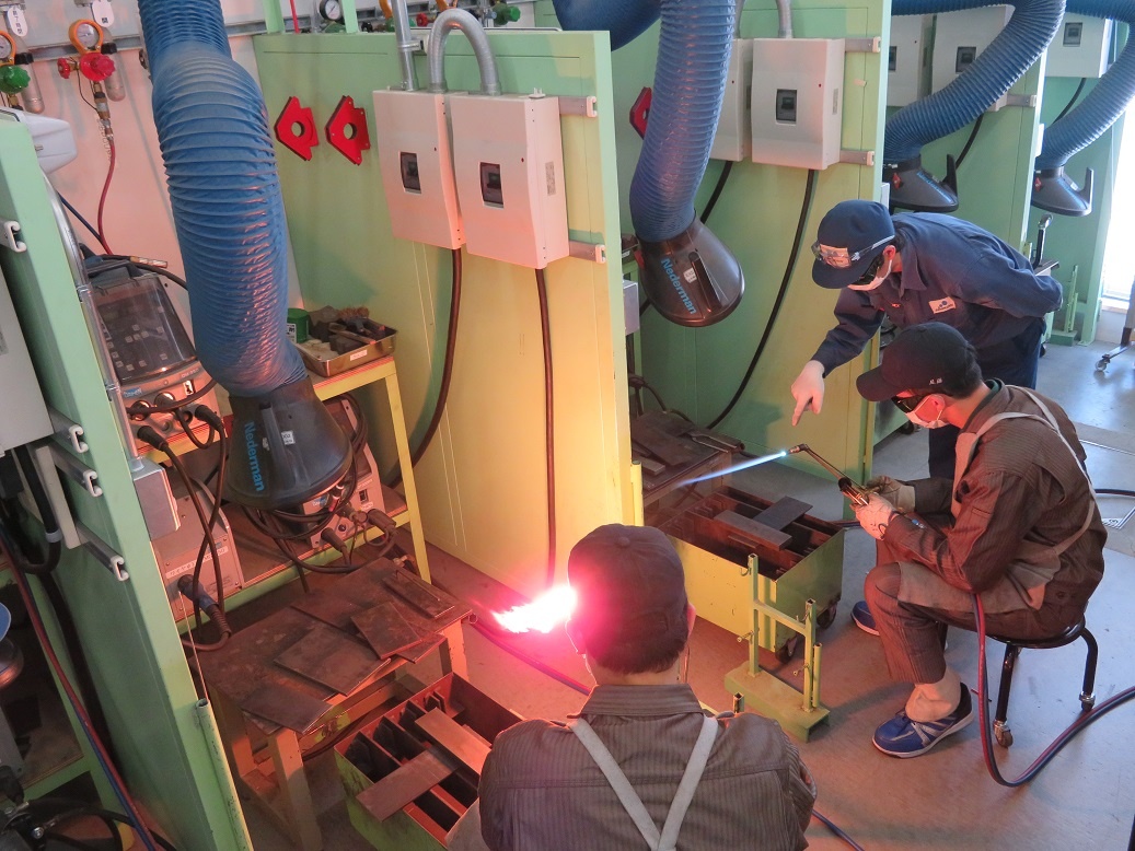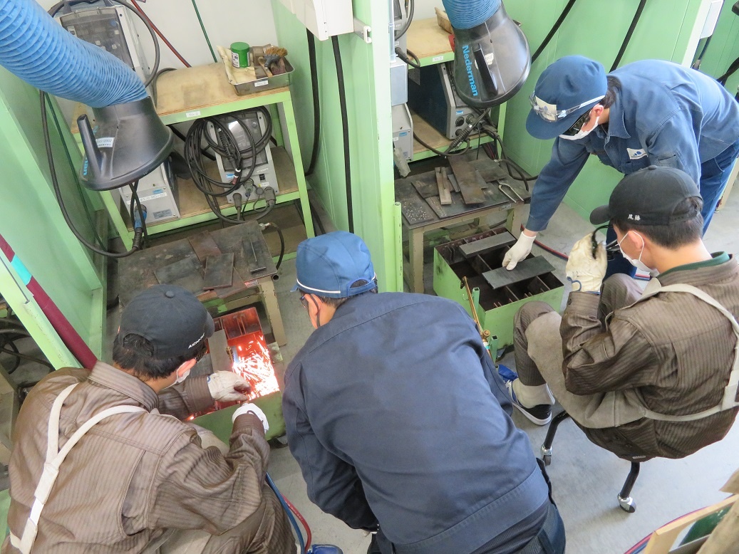 生産システムコースは「マシニングセンタ3軸Ⅰ」、情報システムは「赤外線ロボット」、自動車・航空産業コースは「旋盤/フライス/溶接」、エネルギー産業コースは「電子機器組立」に取り組みました。 「溶接」では、町工場技能者コンクールの第1回・第2回と連続優勝された三周全工業株式会社の方から指導していただきました。