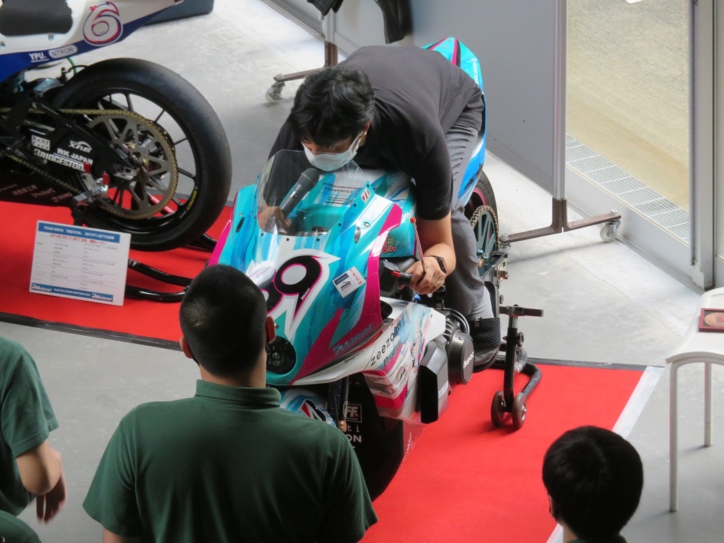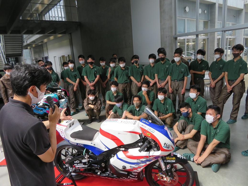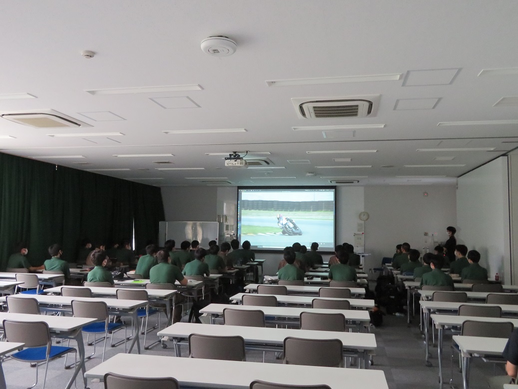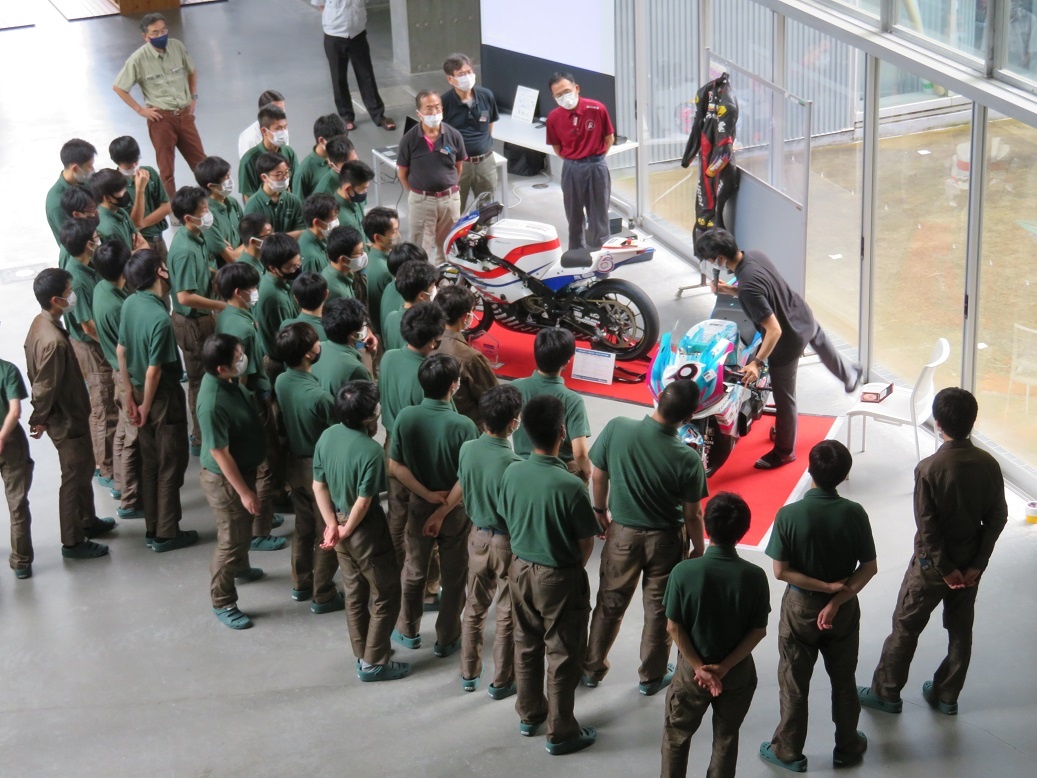 2年生はTEAM MIRAI代表取締役 岸本様による講演を聴きました。電動レーサーの製作を通じて、モータースポーツとしてだけではなく技術と人間力を高めるものとして社会貢献したいと考えているという内容でした。「ミク号&韋駄天」も展示され、生徒達は興味津々でした。