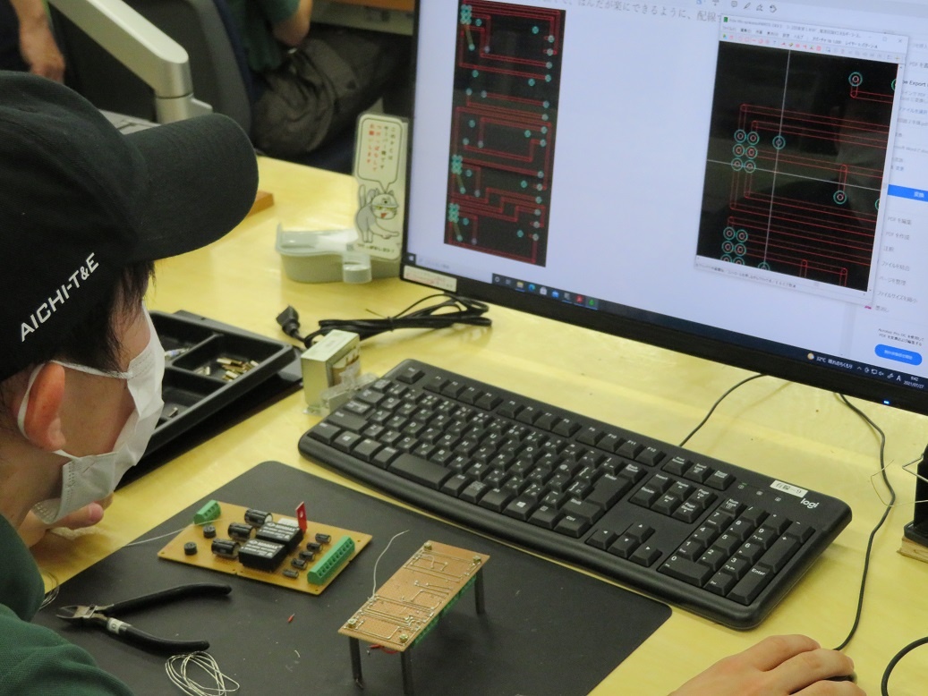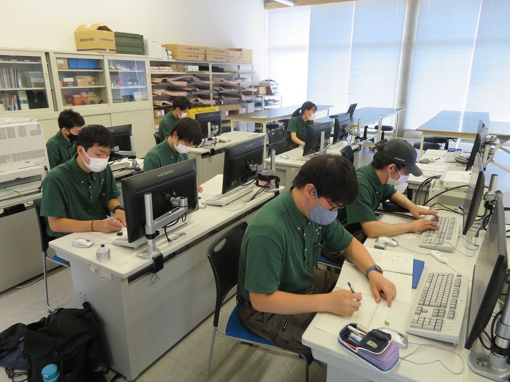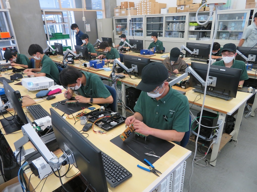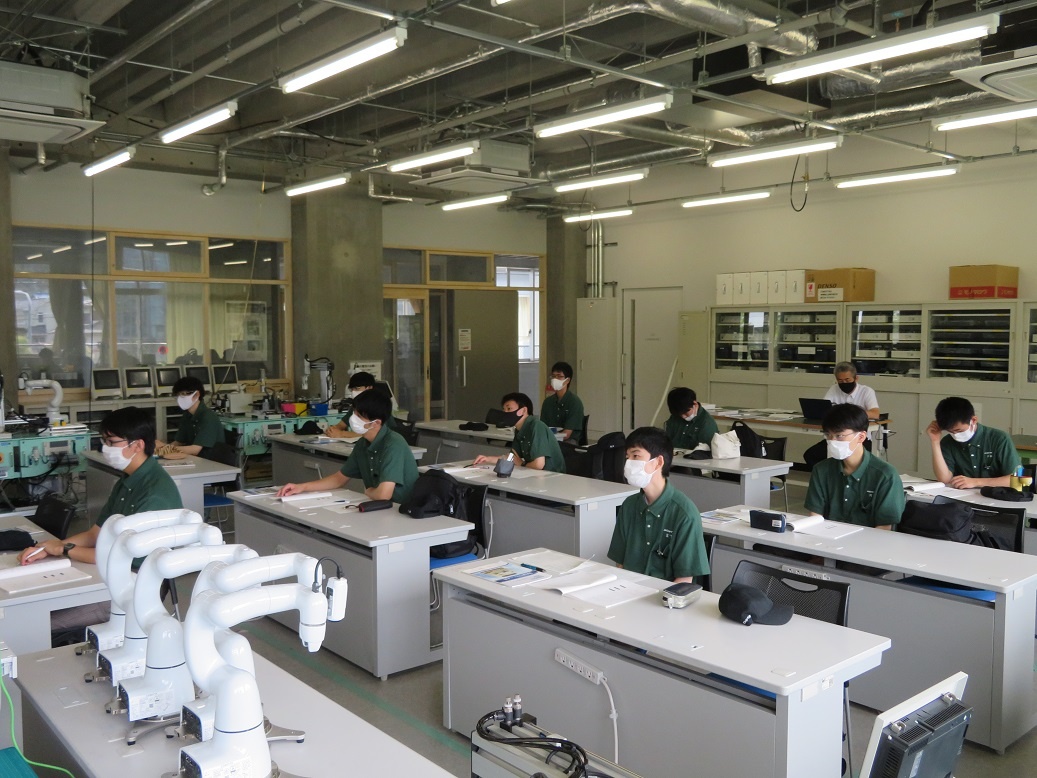 生産システムコースは「マシニングセンタ3軸Ⅱ」、情報システムコースは「シーケンス・PLC」、自動車・航空産業コースは「空気圧制御(校外実習)」、エネルギー産業コースは「電源回路」に取り組みました。これで1年生前期のコース実習が終了しました。