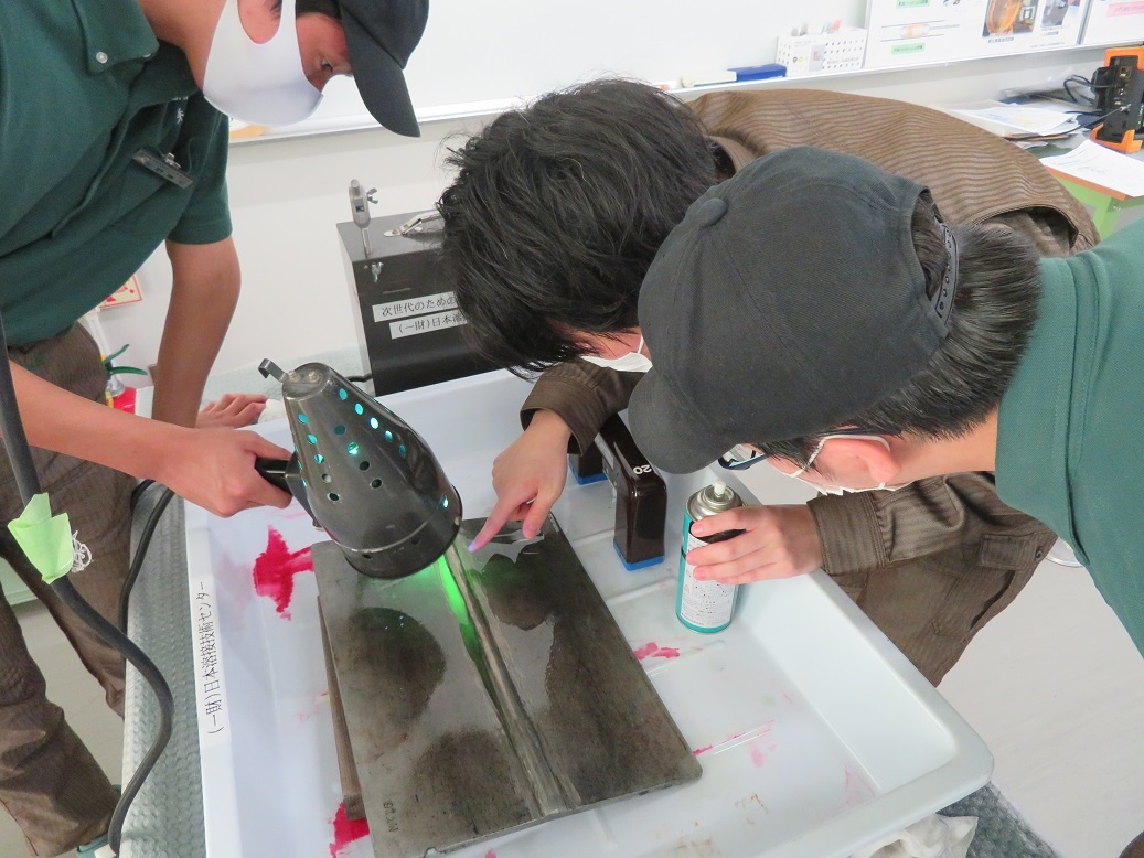 10月12日~13日の2日間で、1年生を対象に「次世代のための非破壊検査セミナー」がありました。座学・実習・実演を通して非破壊検査の役割や検査手法の体験を行い、「浸透探傷試験」「放射線透過試験」「磁粉探傷試験」「超音波探傷試験」「小型無人機ドローン」などについて学びました。
