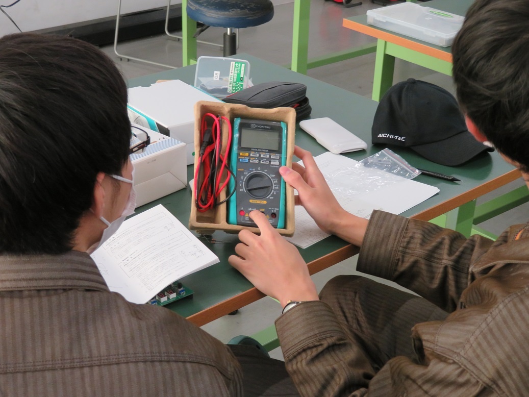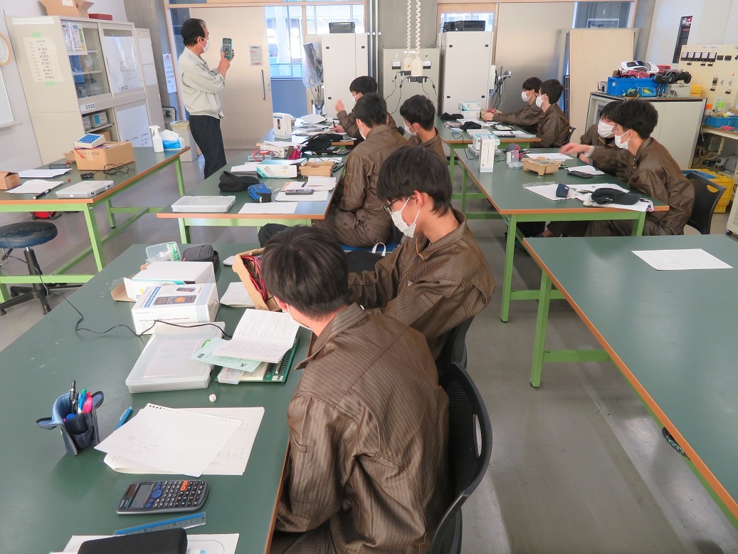 生産システムコースは「空気圧制御(校外実習)」、情報システムコースは「ハードウエア」、自動車・航空産業コースは「自動車製造」、エネルギー産業コースは「伝送路」に取り組みました。「伝送路」は、伝送路の理論値を算出し、実習で行う模擬伝送路の実験値と比較するエネルギー産業コース特有の実習です。