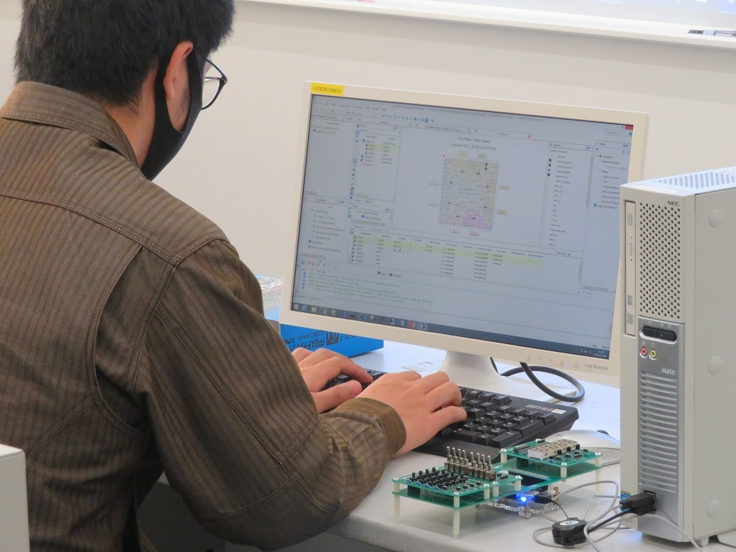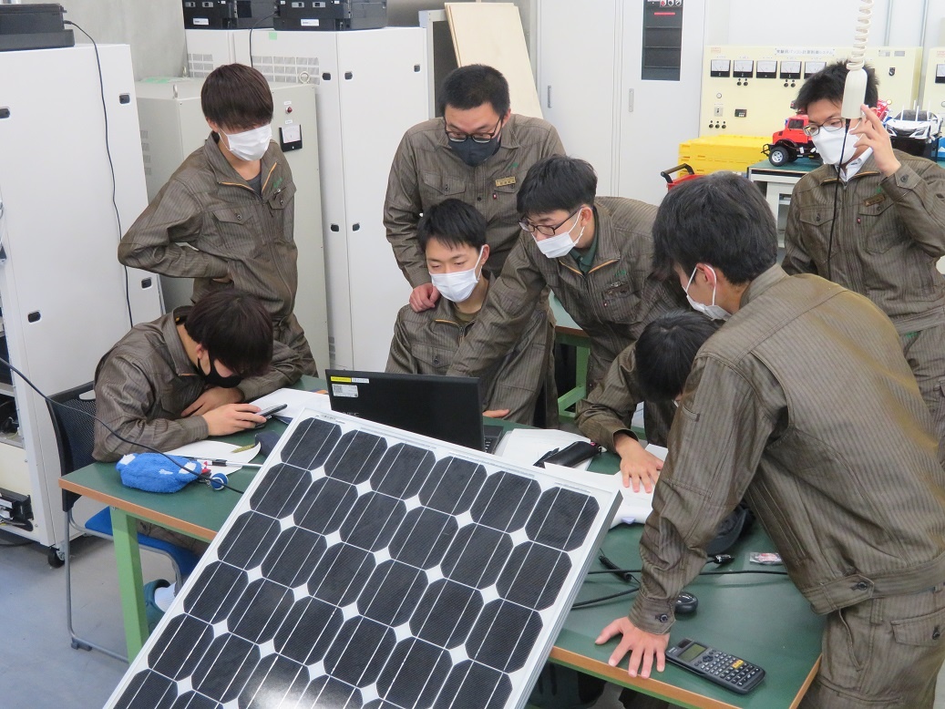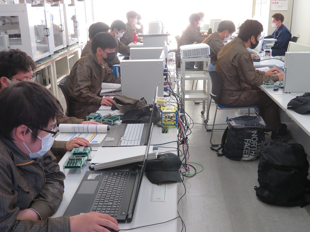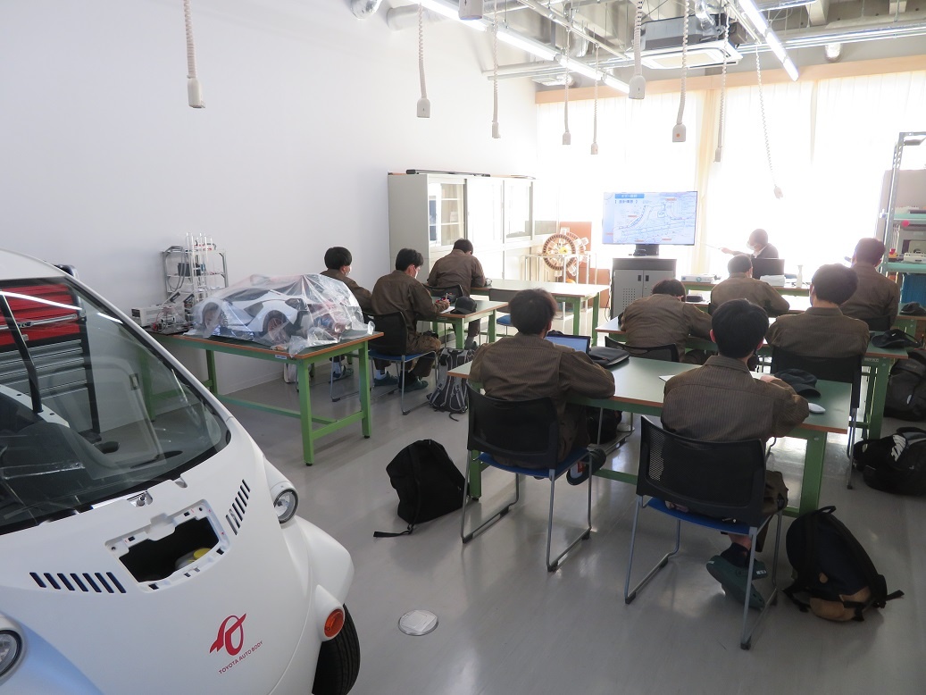 生産システムコースは「FA設備制御2」、情報システムコースは「FPGA」、自動車・航空産業コースは「電気自動車制御」、エネルギー産業コースは「太陽光・高圧受電」に取り組みました。 自動車・航空産業コースは、車の仕組みについて学びました。来週、トヨタ車体(株)へ校外実習に行きます。
