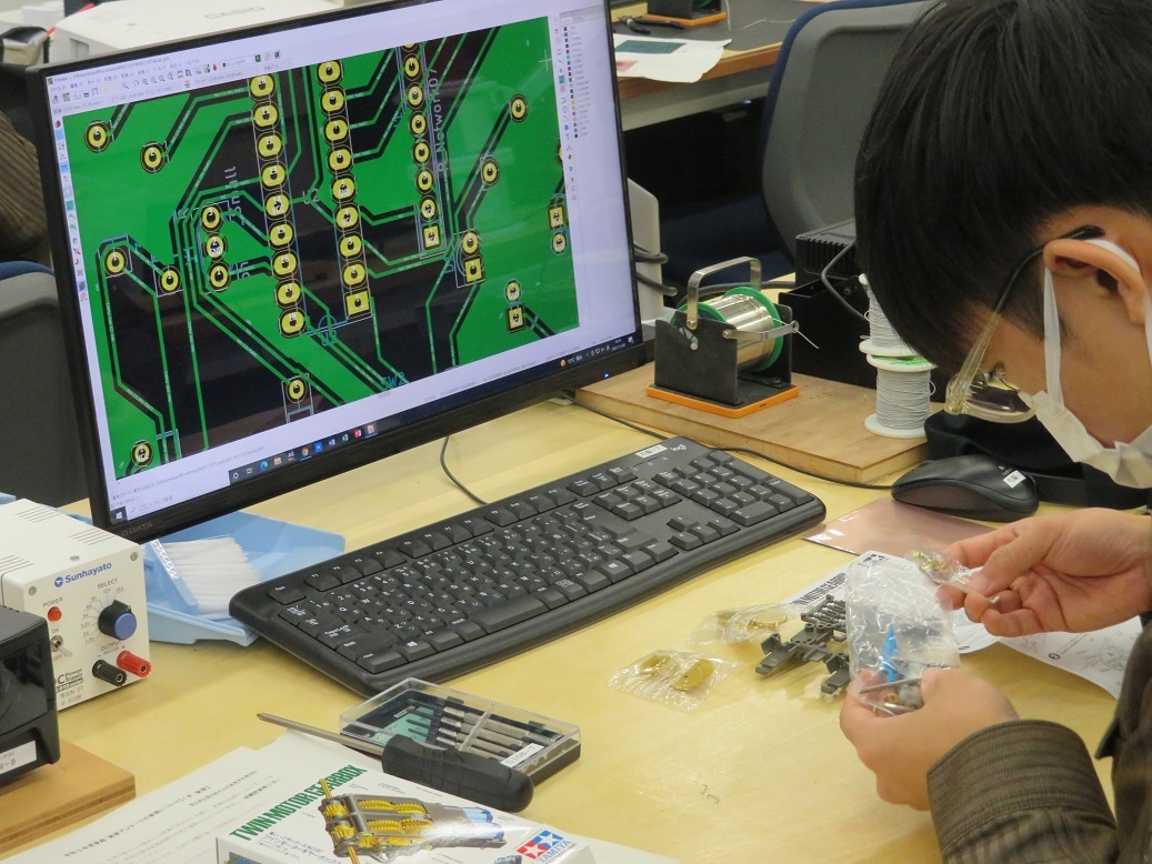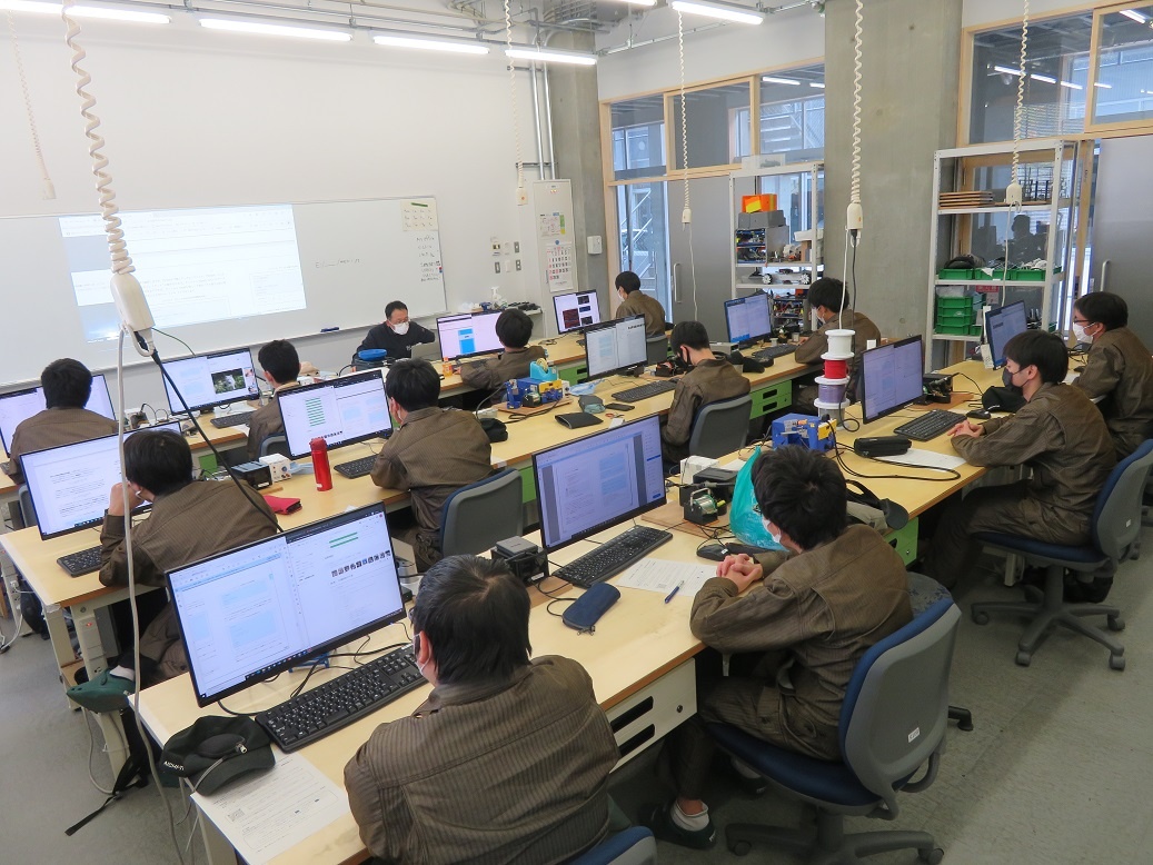 生産システムコースは「マシニングセンタ5軸Ⅰ」、情報システムコースは「ソフトウエア」、自動車・航空産業コースは「3DCAD(ソリッドワークス)」、エネルギー産業コースは「電力設備実習(校外実習)」に取り組みました。