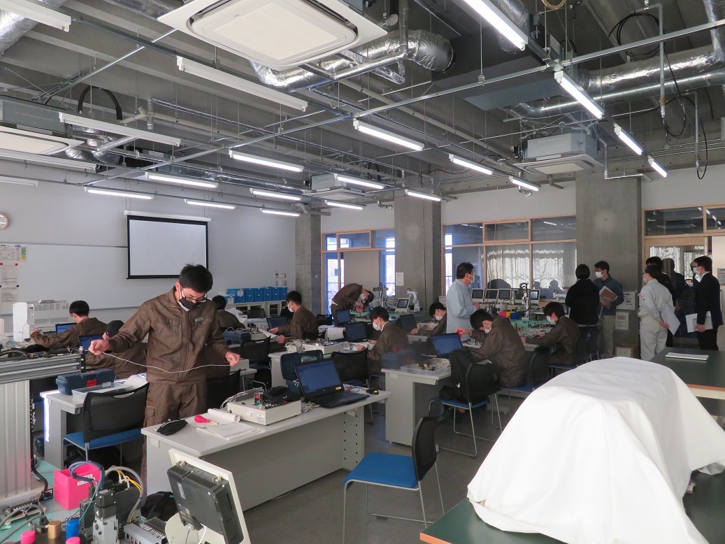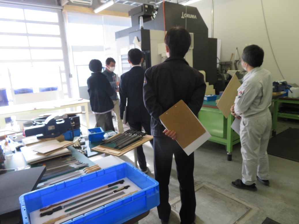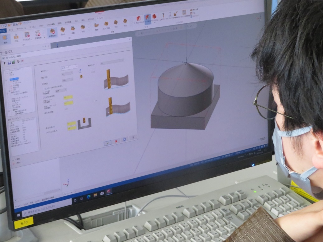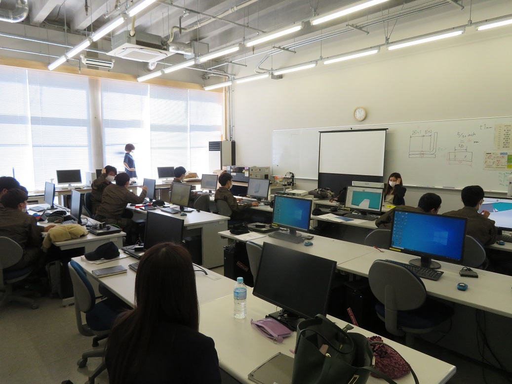 生産システムコース「マシニングセンタ5軸Ⅰ」、情報システムコース「ソフトウエア」、自動車・航空産業コース「3D CAD」、エネルギー産業コース「シーケンス・PLC」を学びました。今日も本科2年生担任の4名の先生方に専攻科見学(2日目)を実施し、専攻科の説明、その後、設備や実習の様子を見学するなど進路指導に活かしていただく取組を行いました。