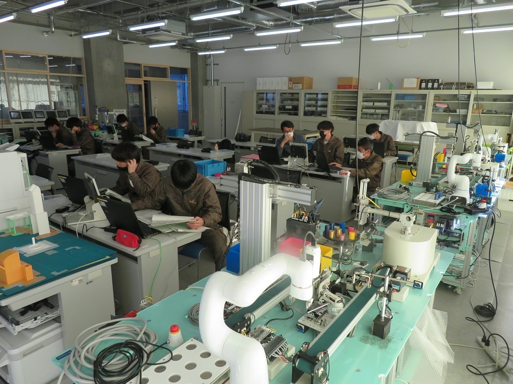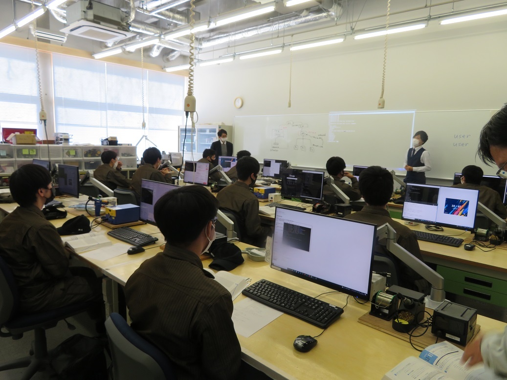 生産システムコース「FAネットワーク」、情報システム「Linuxサーバ」、自動車・航空産業コース「CAE解析Ⅱ」、エネルギー産業コース「ネットワーク」について学びました。 エネルギー産業コースは、実際に校内(専攻科廊下、屋上、本科屋上、校舎外側、本科職員室、敷地内電柱など)に張り巡らされたLANケーブルを探し回り、確認しながら学びました。