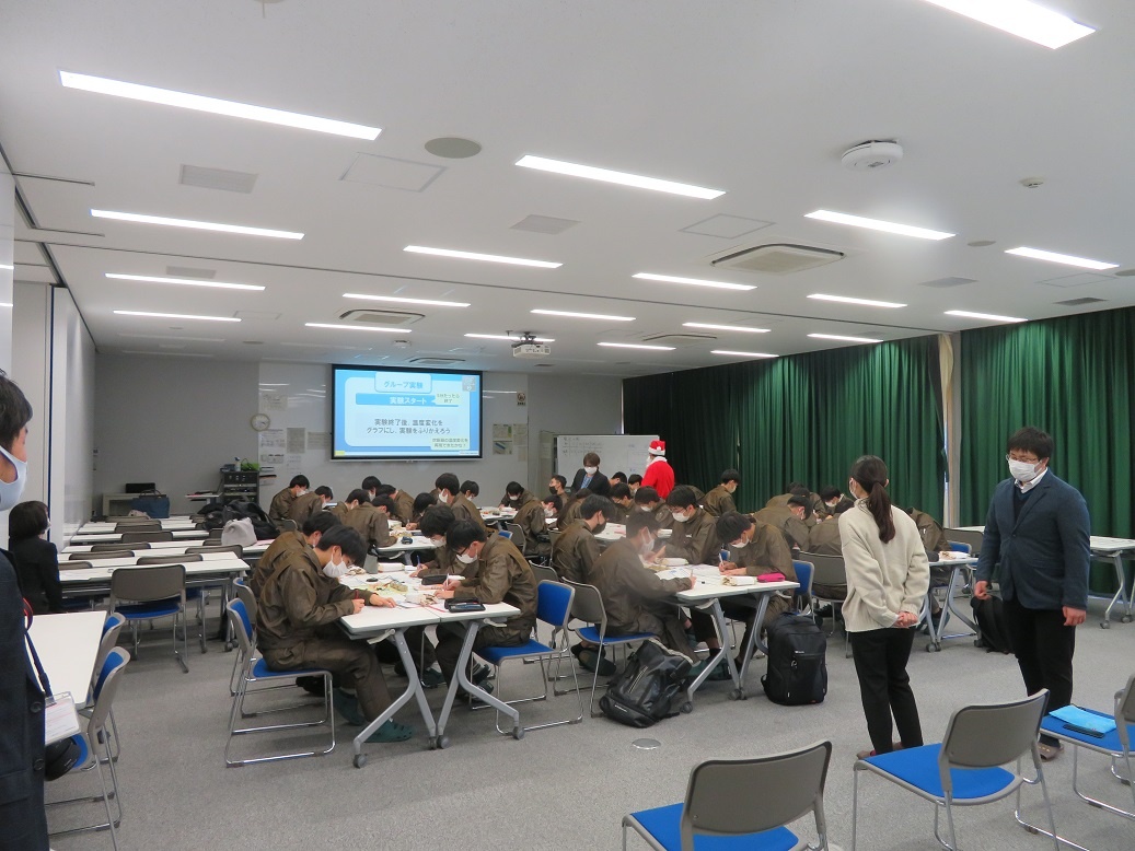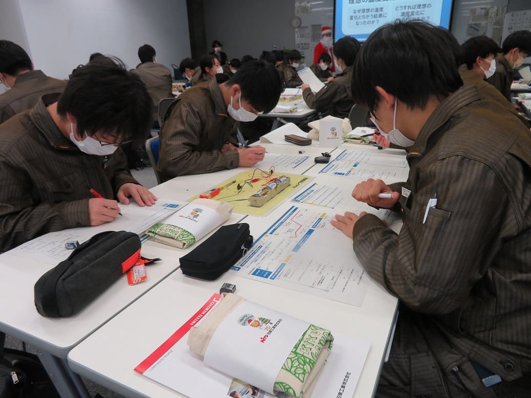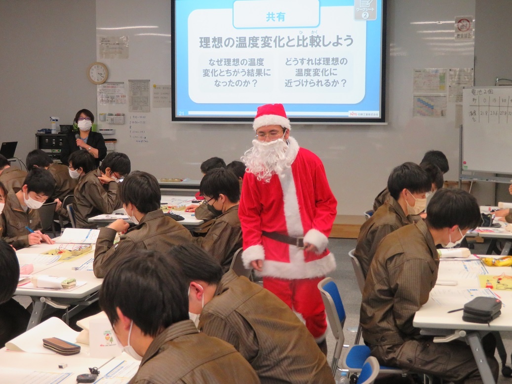 今日の1年生「物理学Ⅱ」の授業は、日東工業(株)の方を講師にお招きし、熱と制御の関係について学びました。サンタクロースに扮した講師の方から、1年生のみなさんにエコバックとボールペンのクリスマスプレゼントをいただきました。