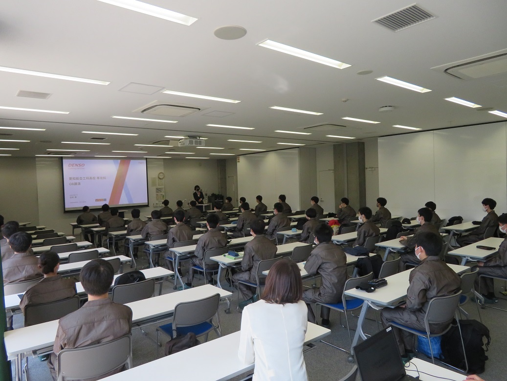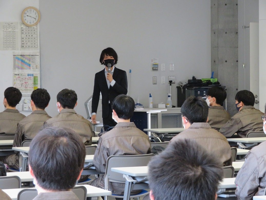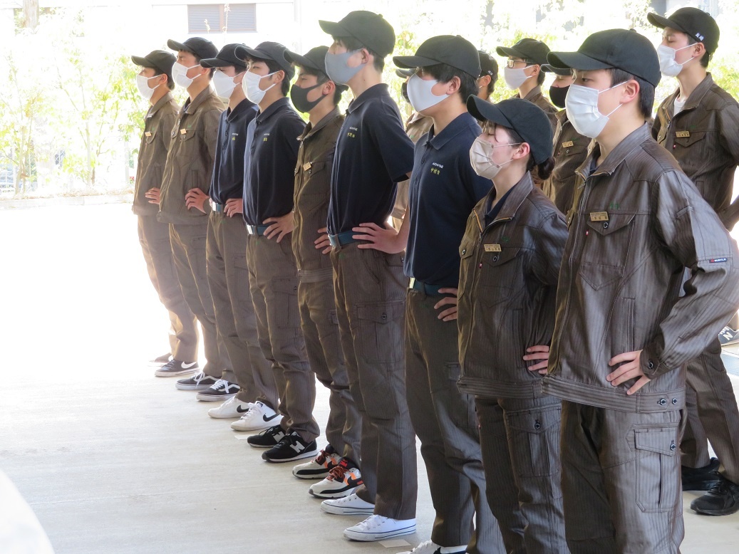 1年生1限は先輩講話でした。「専攻科での取組と会社で働くこと」という内容で、専攻科1期生の北村さんが話をしてくれました。 また午後は点呼練習を行いました。専攻科では総合実習日、コース実習日の朝礼・終礼として点呼を行います。ガイダンスを受けた後、整列や号令の練習に取り組みました。