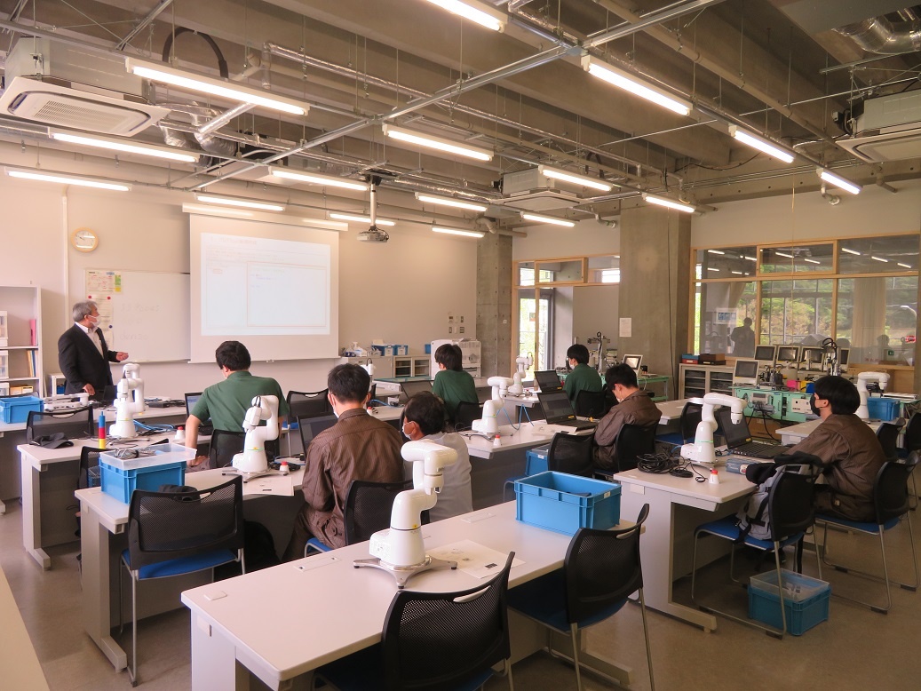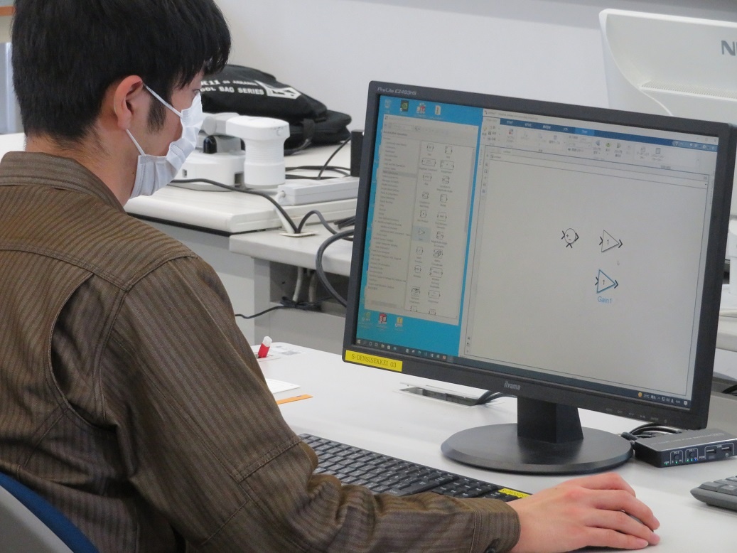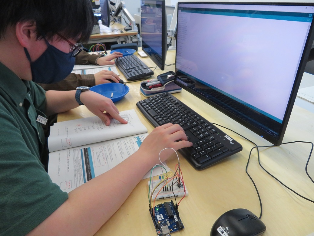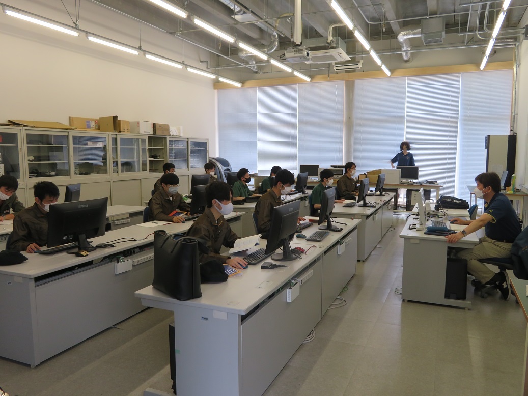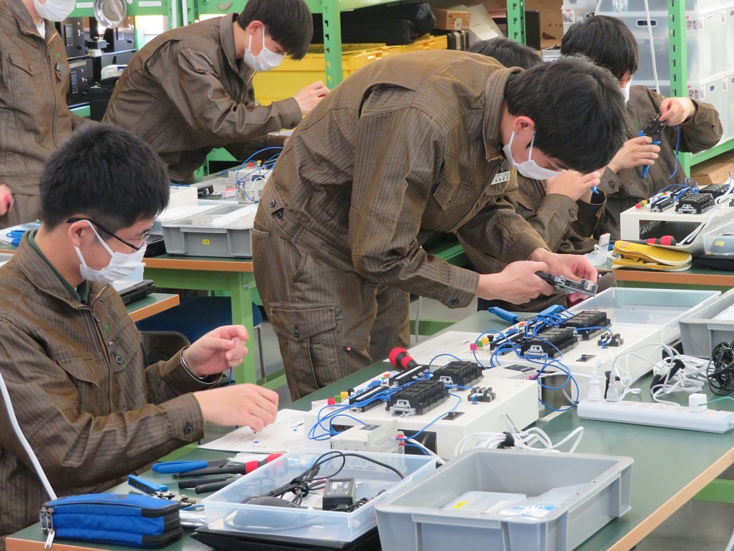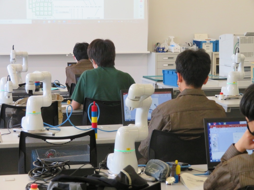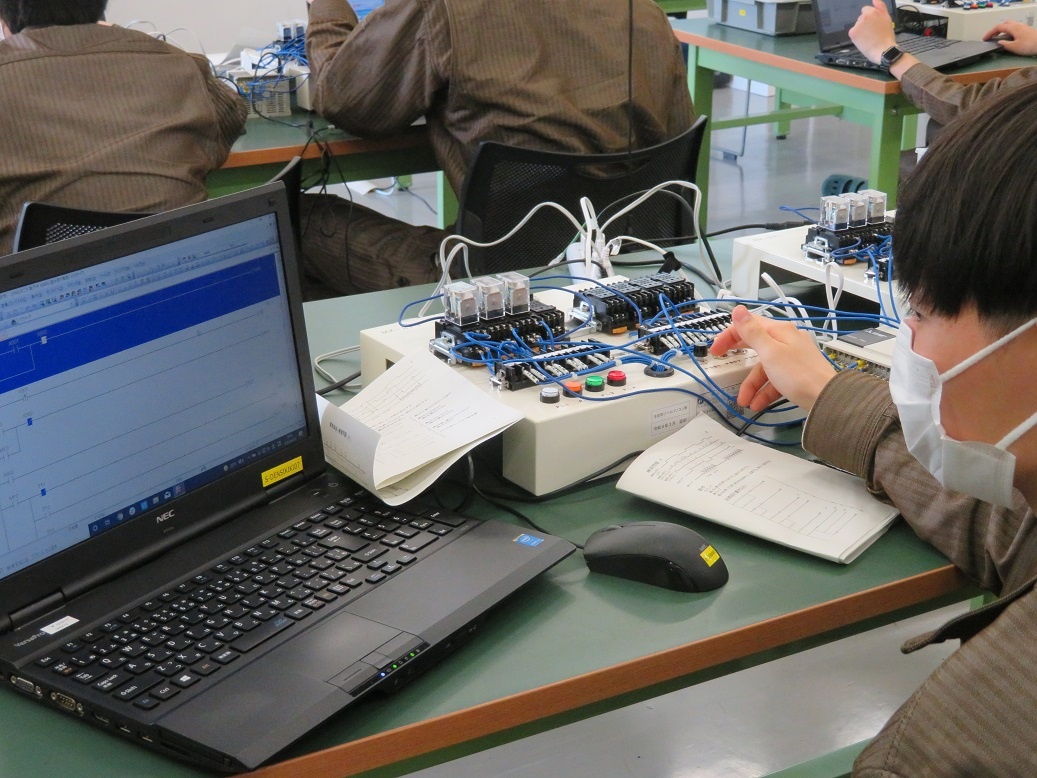 2年生コース実習(3回目)は、生産システムコース「マイコンとネットワーク」、情報システムコース「MATLAB」、自動車・航空産業コース「ロボット特別教育」、エネルギー産業コース「電気保全」に取り組みました。「電気保全」は資格取得に関わる実習です。