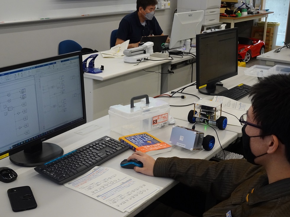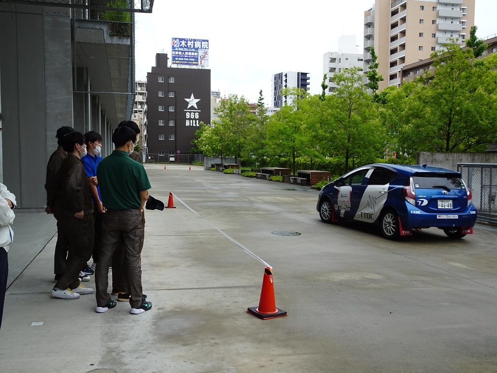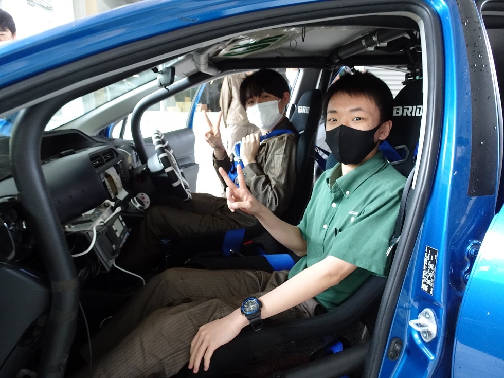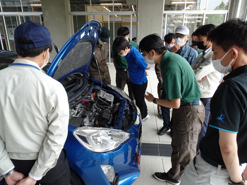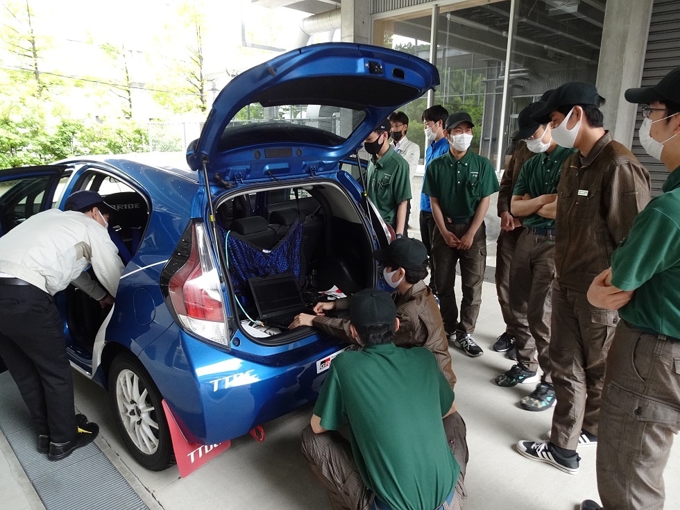 2年生がコース実習でした。情報システムコース「電子計測・解析」では、トヨタテクニカルディベロップメント(TTDC)社の協力により、車輌に関するコンピュータ計測技術について学びました。当日は実際に使われているラリー車を持ってきていただき、その取り付けや計測方法・解析について学びました。車輌を扱うための安全教育KYTも事前に学びました。