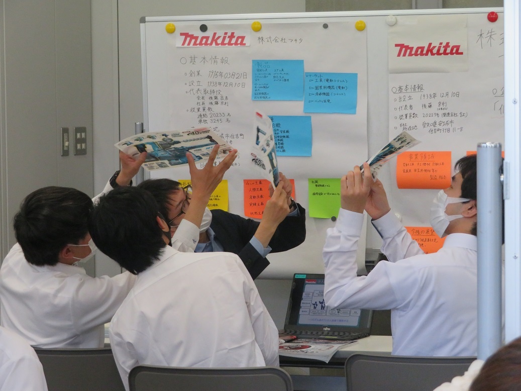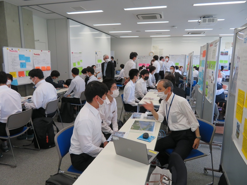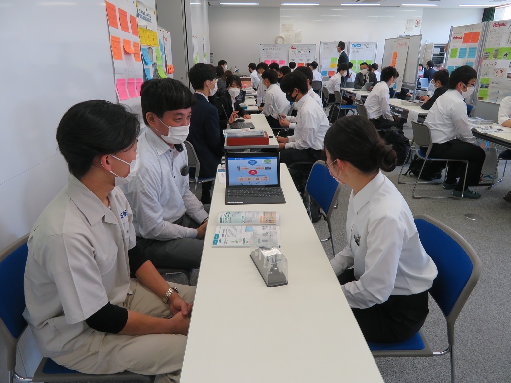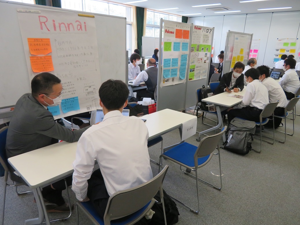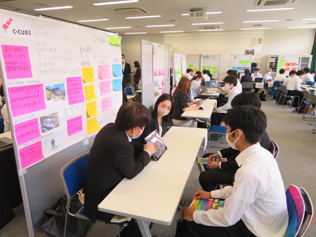 1年生は3週にわたり「業界・企業研究」に取り組んできました。1週目は座学で業界や企業について学び、2週目は各自で企業の調べ学習を行い、3週目は調べたものを発表しました。4週目の今日は、学内合説イベントとして、24社にご来校いただき、調べ学習をした企業から直接説明を聞くことができました。