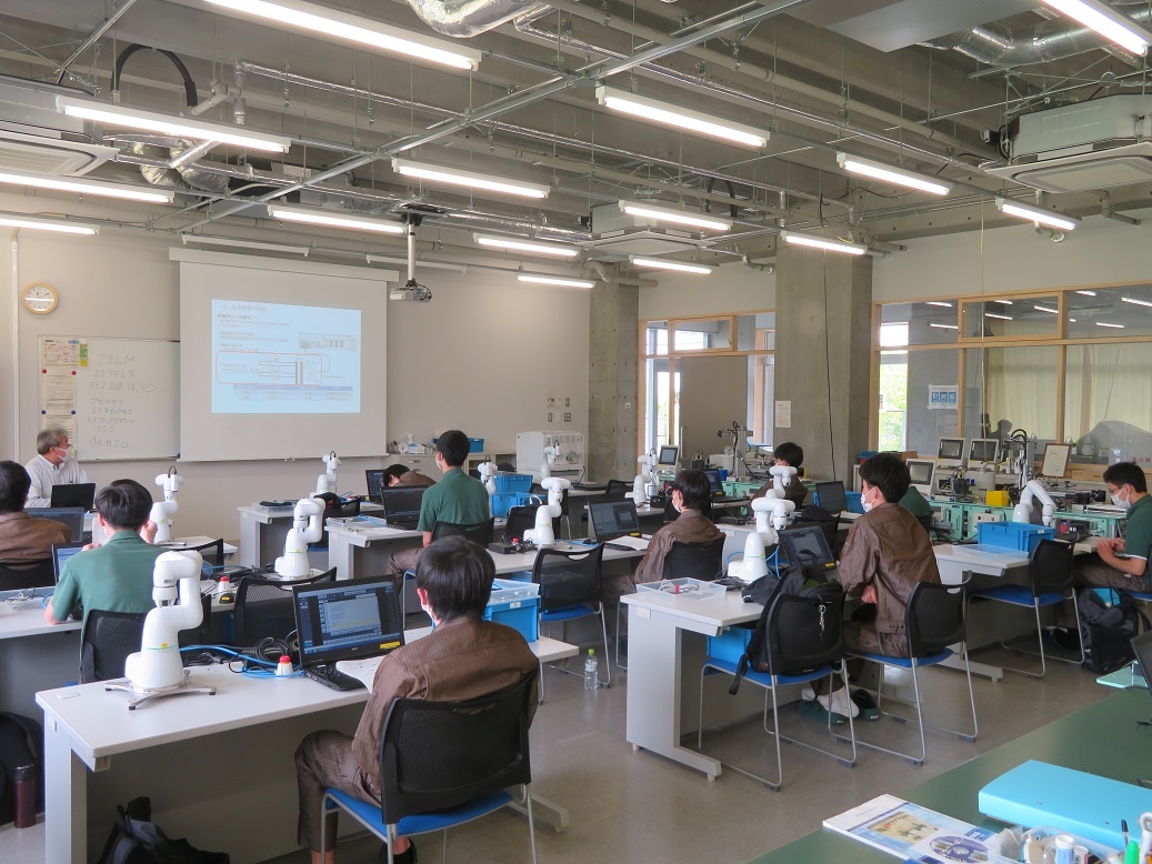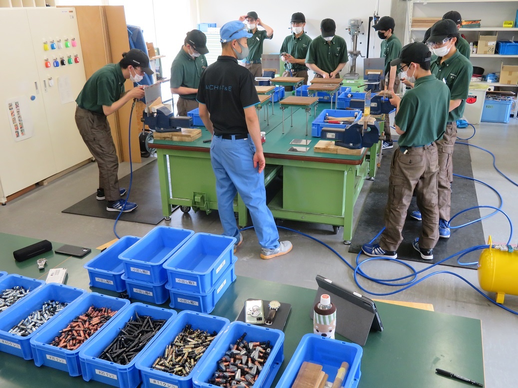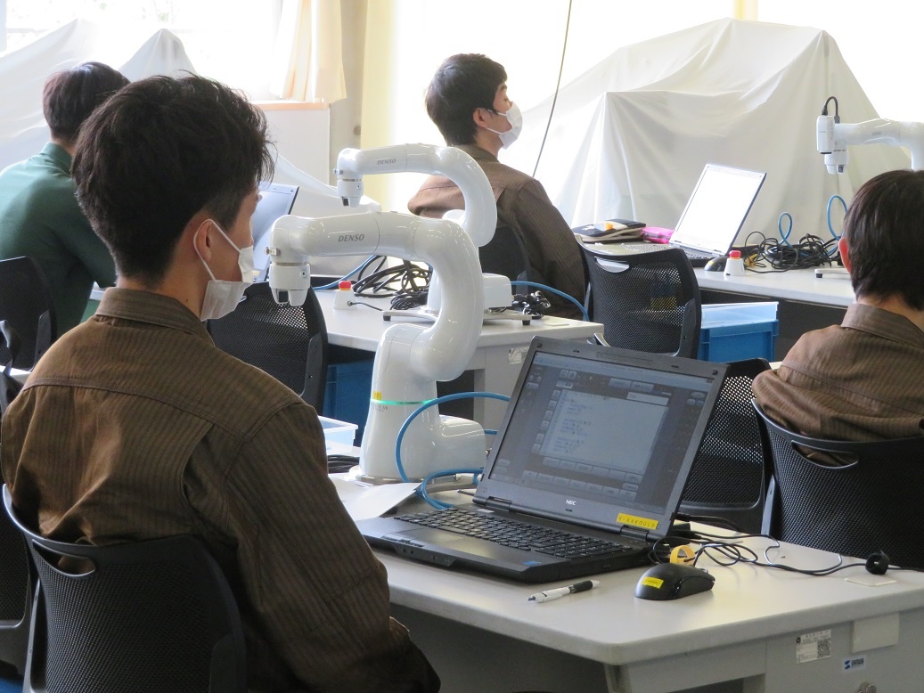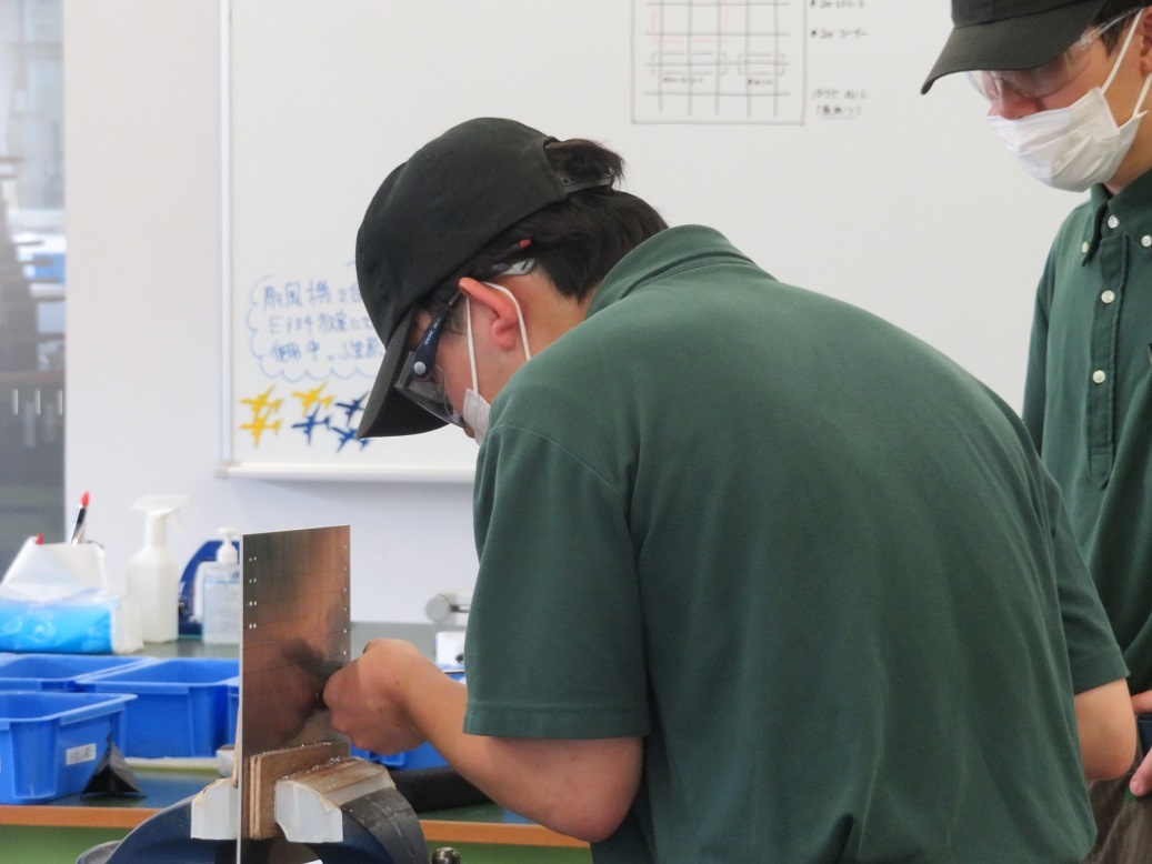 2年生コース実習でした。生産システムコース「パワーエレクトロニクス(インバータ制御)」(三菱FAセンターにて校外実習)、情報システムコース「ネットワーク(WAN)」、自動車・航空産業コース「航空機製造Ⅰ(穴開け、丸鋲)」、エネルギー産業コース「ロボット特別教育(プログラミング)」に取り組みました。