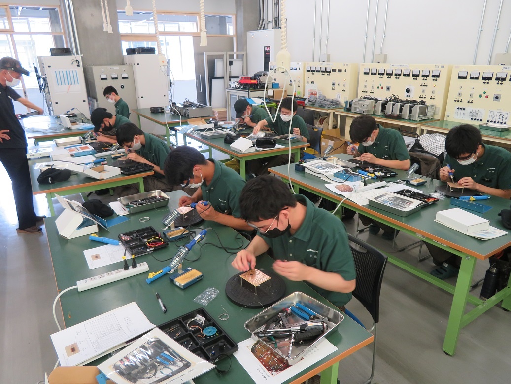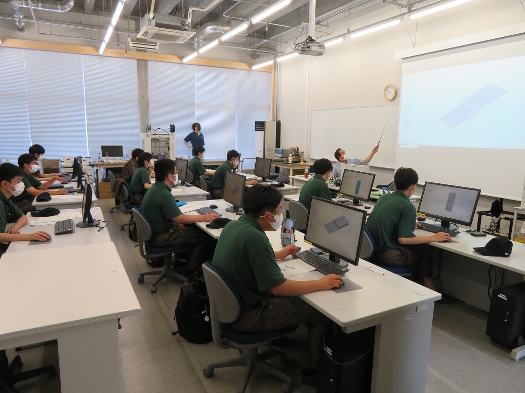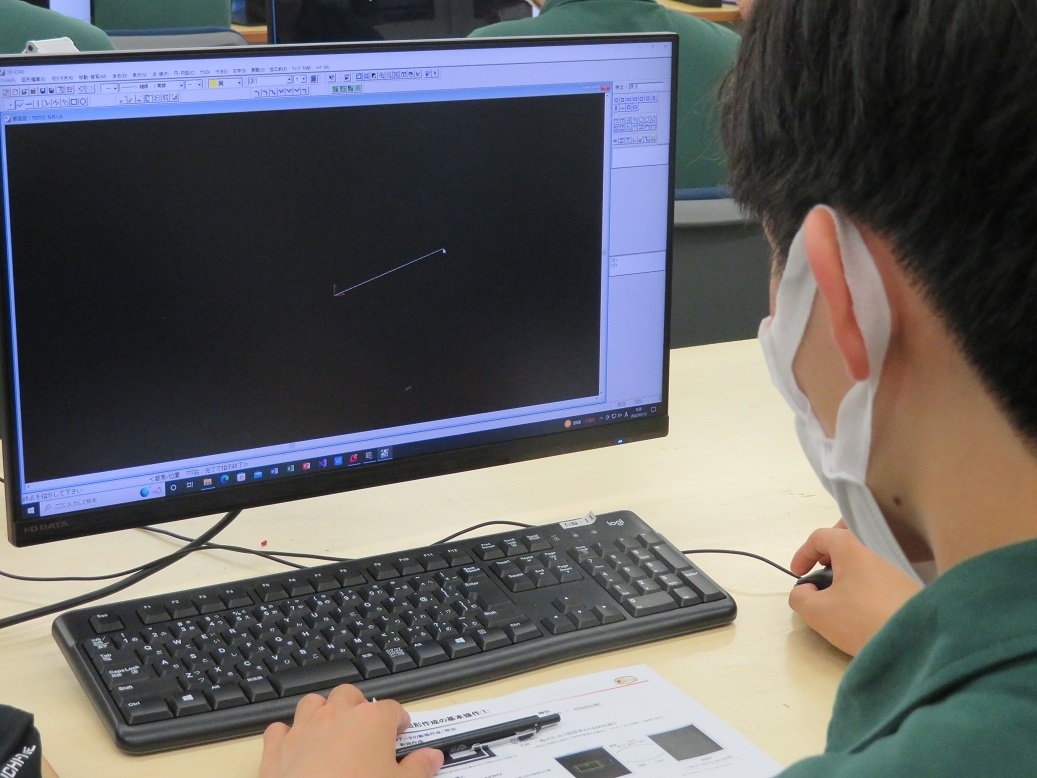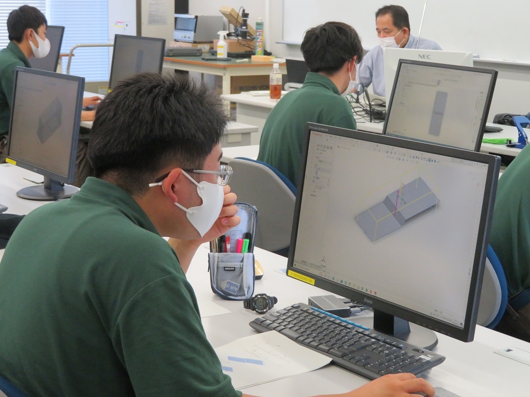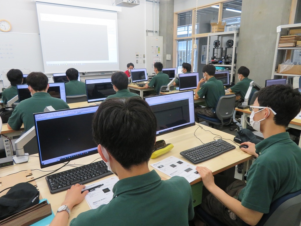 1年生コース実習は、自動車・航空コース「マシニングセンタ(CAM操作)」、電気・制御コース「電子機器組立(半田作業)」、情報・ITコース「CAD(3D使用方法・作図)」、電子・ロボットコース「レーザー加工(AP100)」と、今日から新しいテーマに取り組みました。