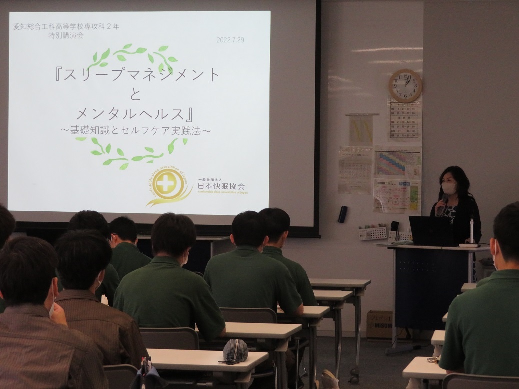 2限2年生、3限1年生は今枝先生(日本快眠協会 スリープケアマスター)より「スリープマネジメントとメンタルヘルス~基礎知識とセルフケア実践法~」の講義を聴きました。自分の睡眠の状態を知り、睡眠力を鍛える方法について学びました。 また、2年生総合実習「エコモビリティ技術・再生可能エネルギーの研究と実践」班は大会に向け機材搬出を行いました。