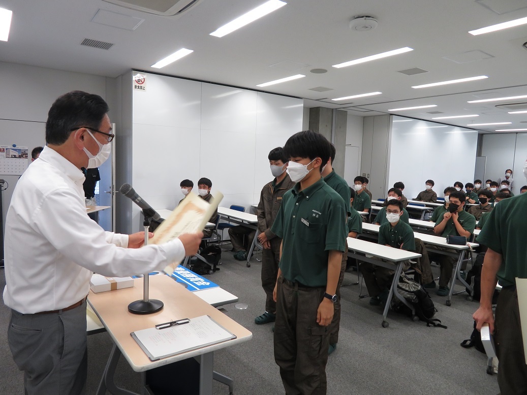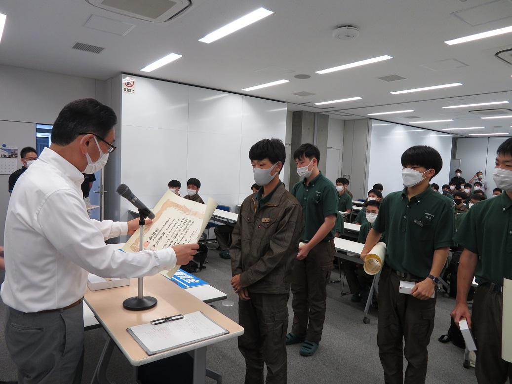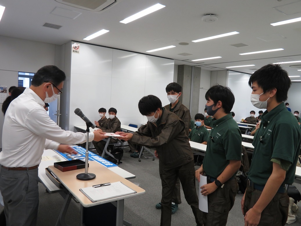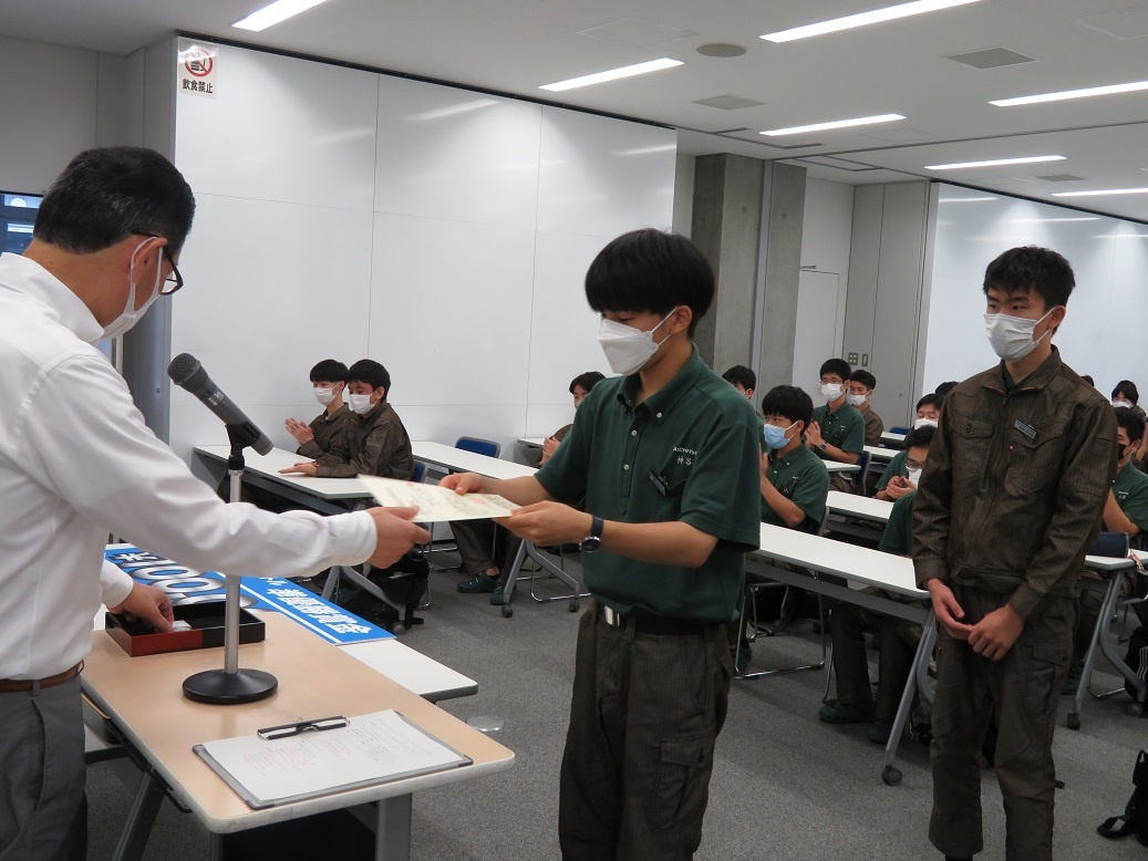 1年生・2年生合同の表彰式が行われました。前期に取り組んだ、若年者ものづくり競技大会、ワールドグリーンチャレンジ、キャチロボバトル、技能検定の成果がみんなの前で披露されました。