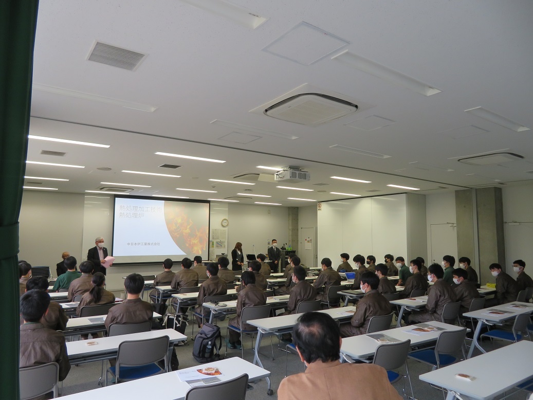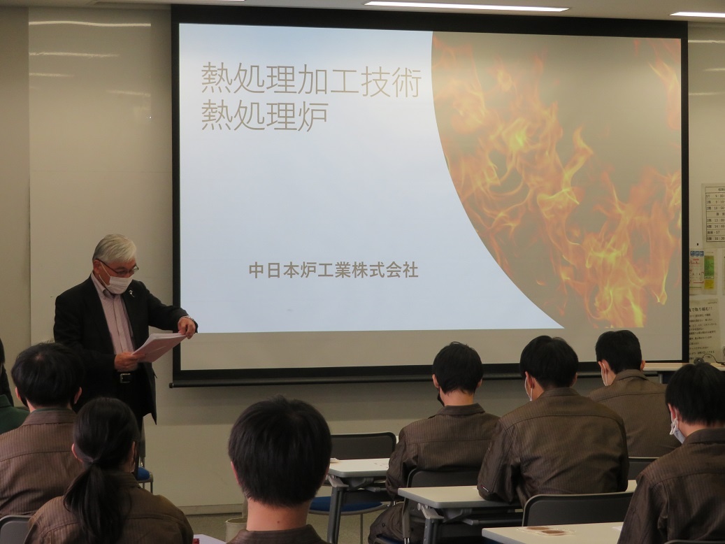 技能五輪全国大会で金賞となった1年生戸田くんの横断幕ができました♪ 今日は1年生・2年生ともに補講日でした。1年生は「生産管理技術Ⅰ」で、トヨタの生産方式を学んだり、「物理学Ⅱ」では中日本炉株式会社講師による熱処理加工技術について学びました。