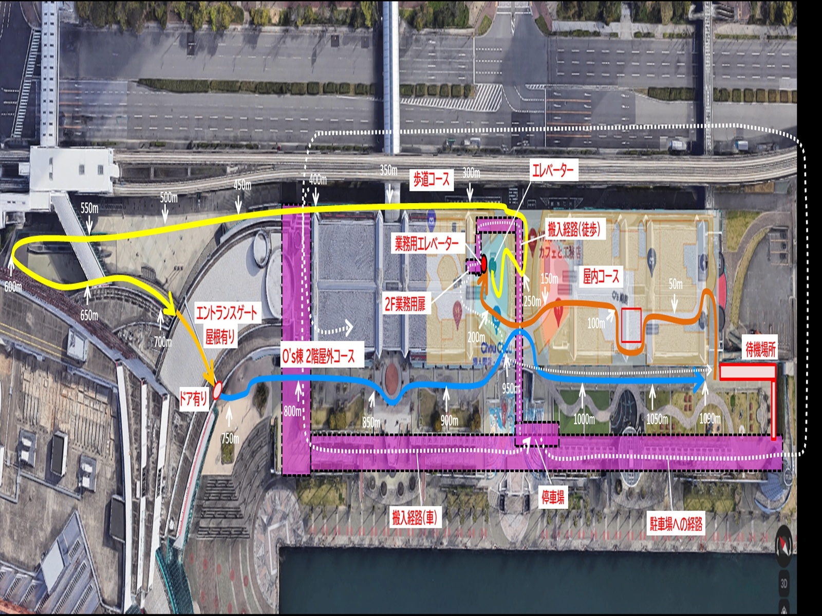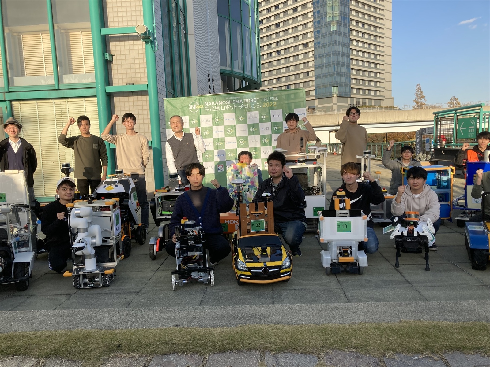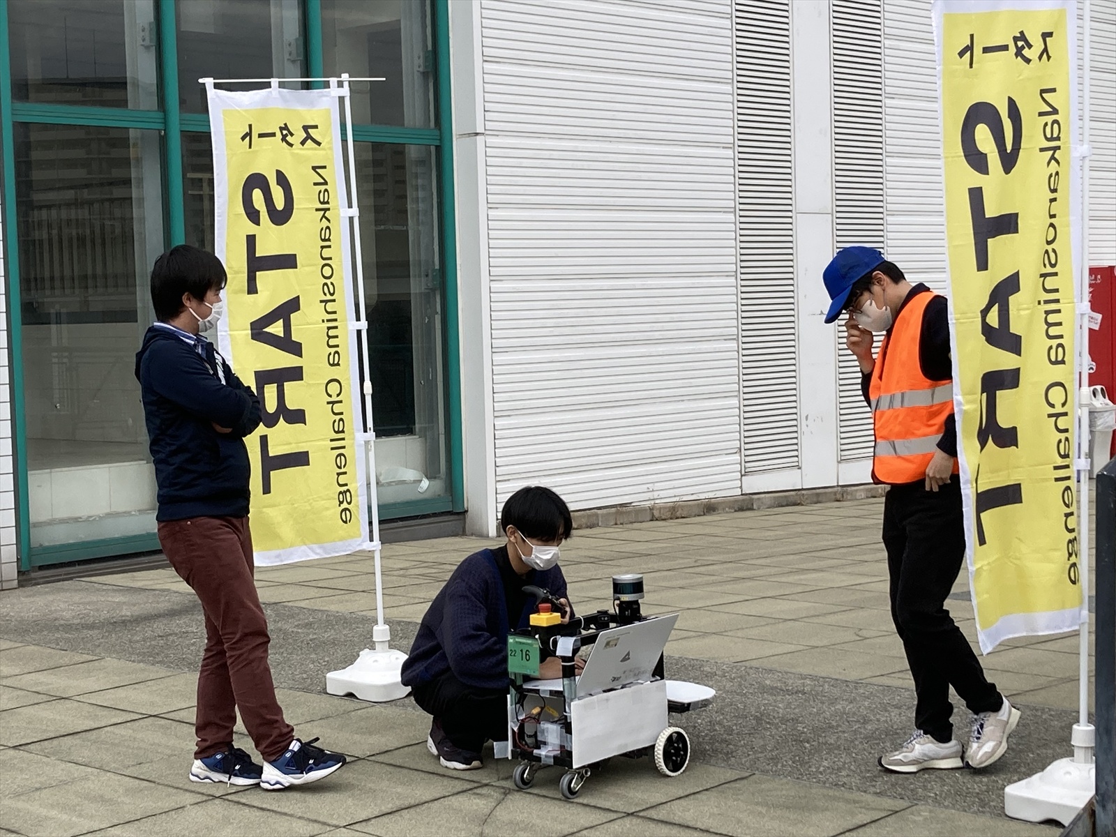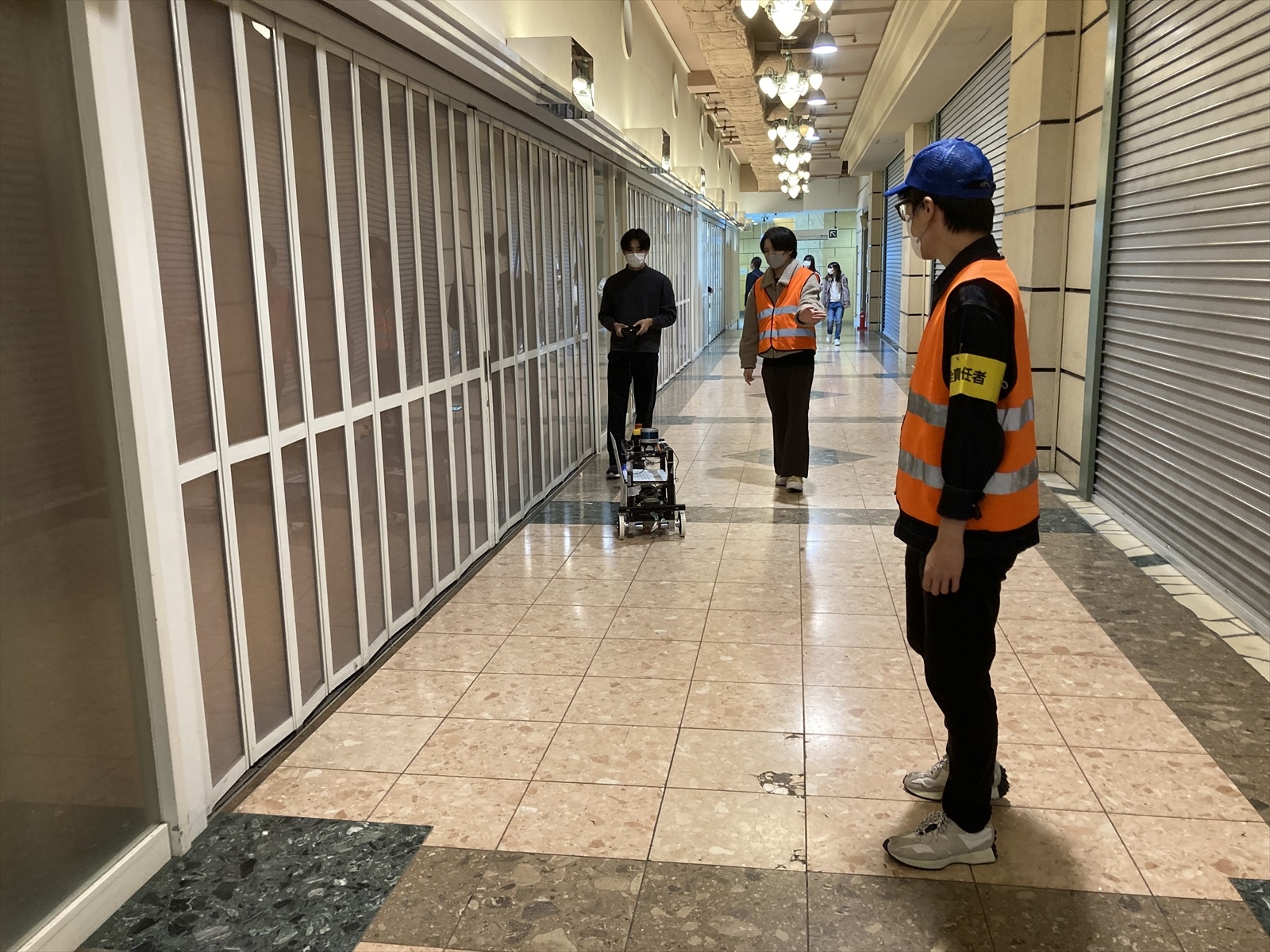 2年総合実習「自動運転支援用プレビューセンサー開発と実践Ⅱ」班は、大阪市住之江区南港北のアジア太平洋トレードセンターで大阪市域屋外自律移動ロボット実証実験事業の中之島エクストラチャレンジに参加しました。参加チーム(16チーム)(神戸高専、関西大学、甲南大学)はセンターの南側から廊下を通り、エレベータで2階から1階へ下り、歩道を1周するコースで実験を行いました。LiDARでマップを作成したりルートを記憶するための実験走行を行い、自己位置を推定しながら自動運転を行いました。完走は4チームで、専攻科はエレベータ付近まで行くことができました。