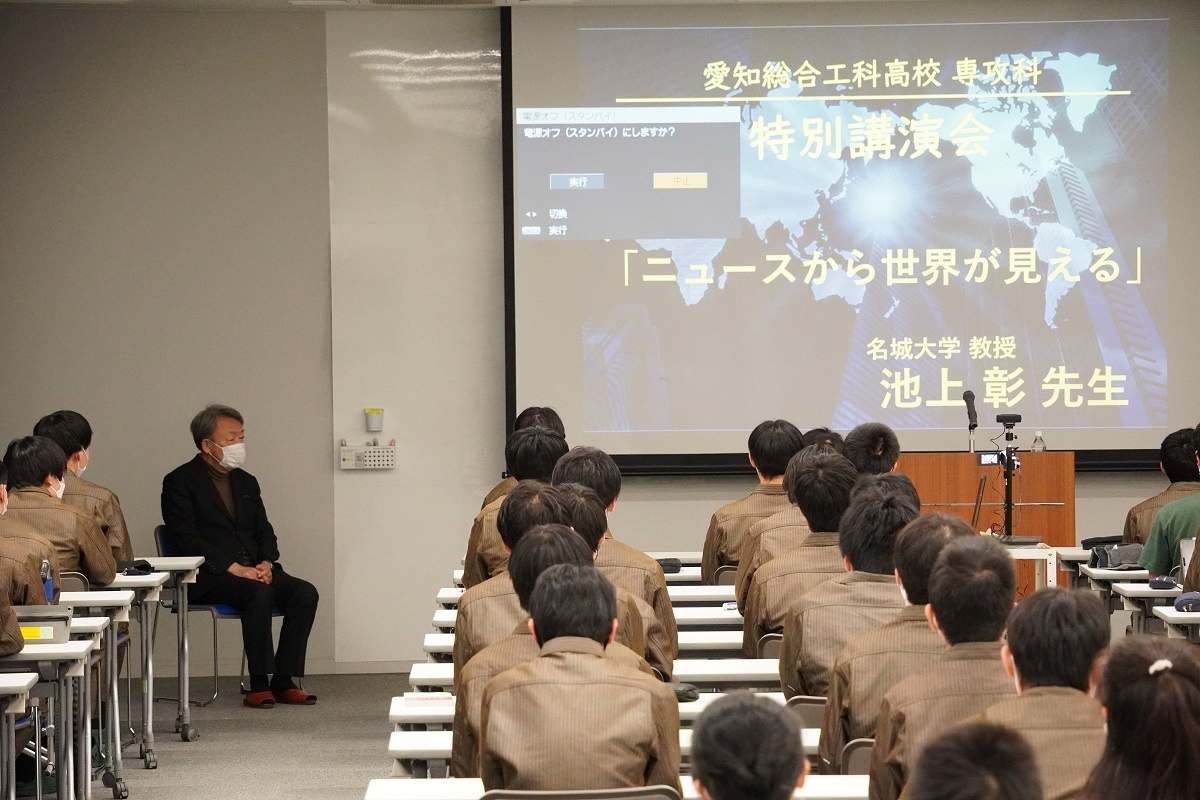 今日は4限「池上彰先生特別講演会」が行われました。「ニュースから世界が見える」というテーマで、1年・2年生徒、PTA役員、教職員など約100名が参加し、世界各国の政治等について貴重なお話を聞くことができました。