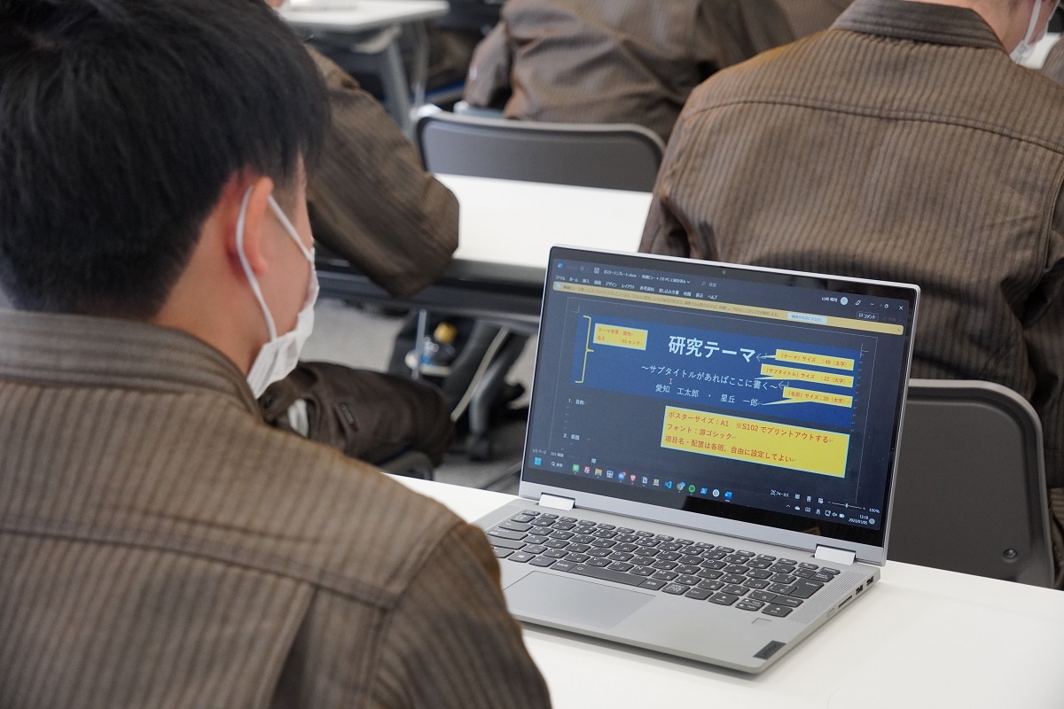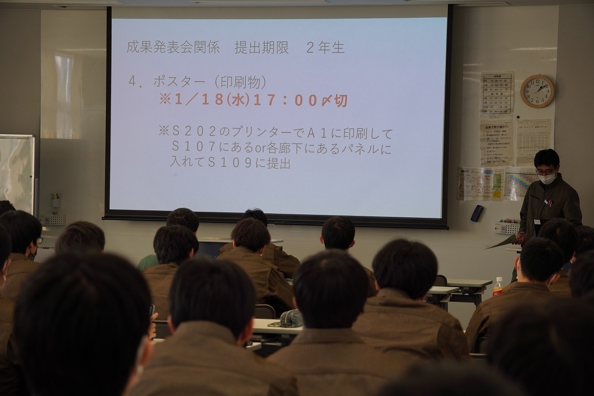 あけましておめでとうございます。専攻科では今日から授業が始まりました。 1年生・2年生合同で学習成果発表会打合せが行われ、発表会に向けて準備の説明や、総合実習班に別れ、ポスター製作などに取り組みました。