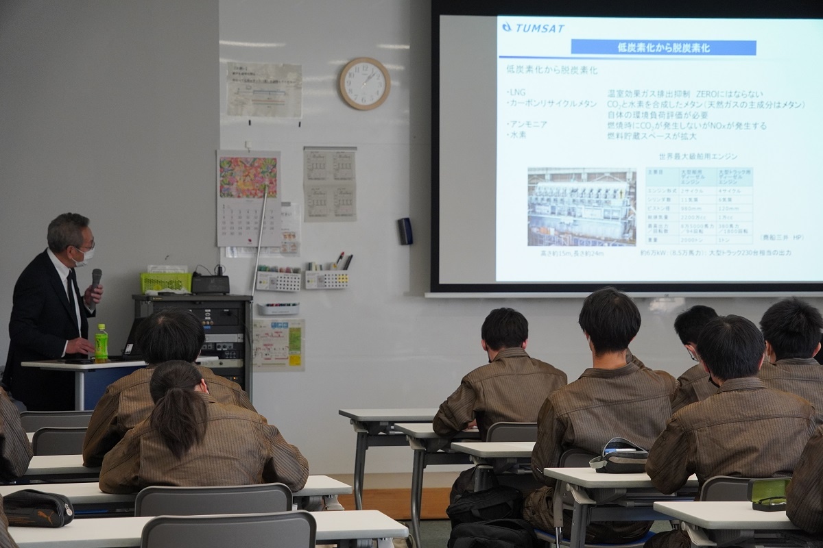1年生3限は東京海洋大学 大出先生による特別講演会でした。「電池推進船と水素燃料電池船」というテーマで、船舶に起因する環境問題など、貴重なお話を聞くことができました。