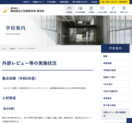 外部レビュー等の実施状況を更新いたしました。 2024/04/02 トピックス ツイート 外部レビュー等の実施状況を更新いたしました。 こちらからご覧いただけます。 https://www.aichi-te-ad.jp/school-information/review.html